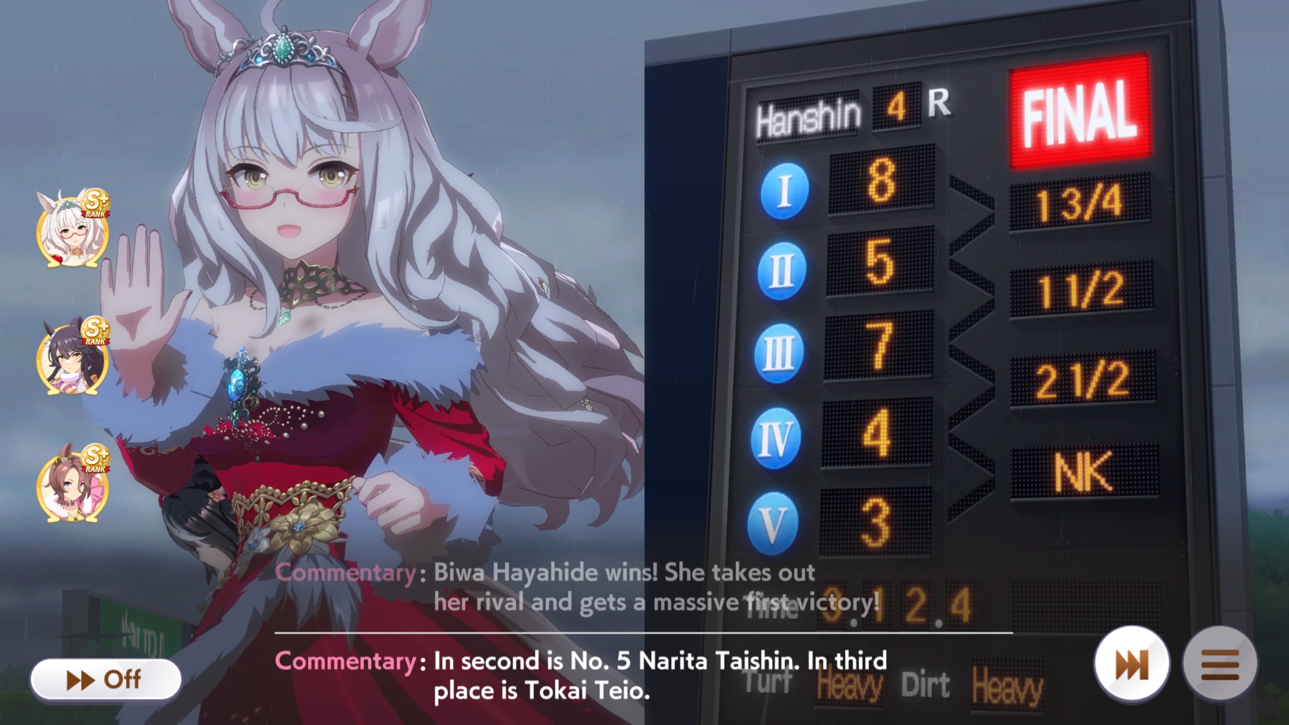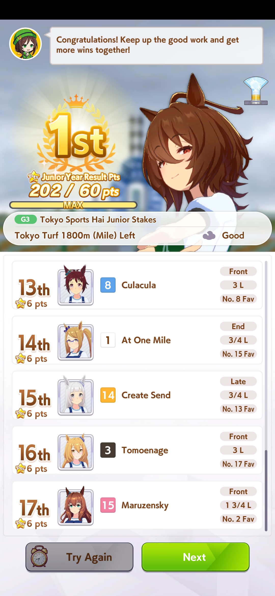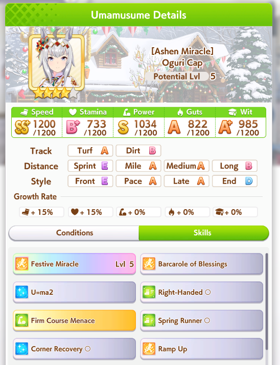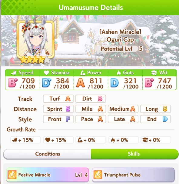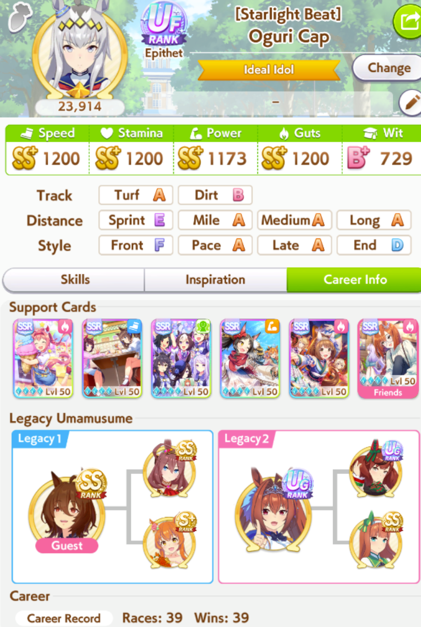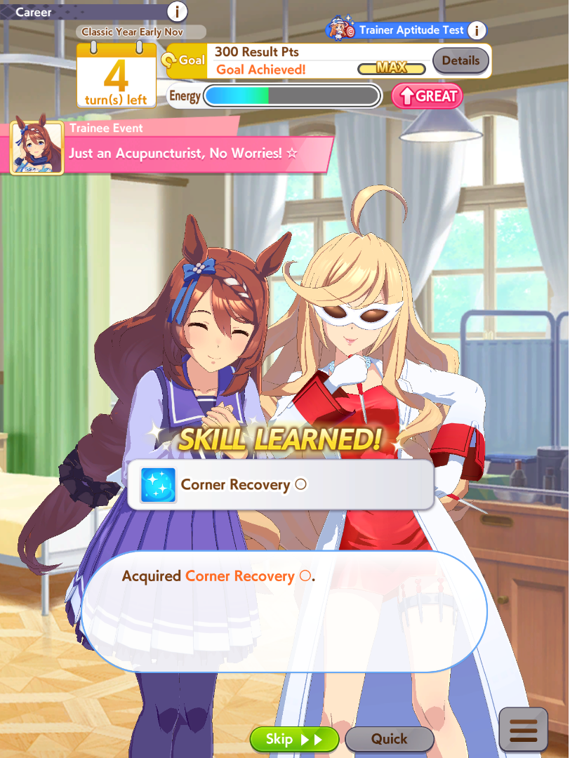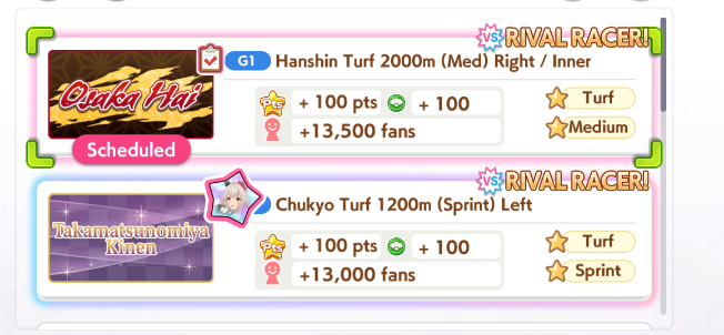 >>562156090This Hoguri won 15 of my 40 races so far, and I made her in one attempt and it was a fairly Shraoki-sama blessed run.>Get Nimble Navigator from that Teio slice-of-life event>S Long in the first inspiration>Head-On somewhere between first summer and end of Classic YearA large amount of training choices I could have selected better, but this happened before I went to bed Marvelous Sunday night, and I just needed a third uma where I didn't want to think that much about stamina. Maybe she'll be all I need to luckshit into A Finals, but now I'm working to refine VBobo so she isn't just an assist buddy to Kitasan and get more than 1 win.
