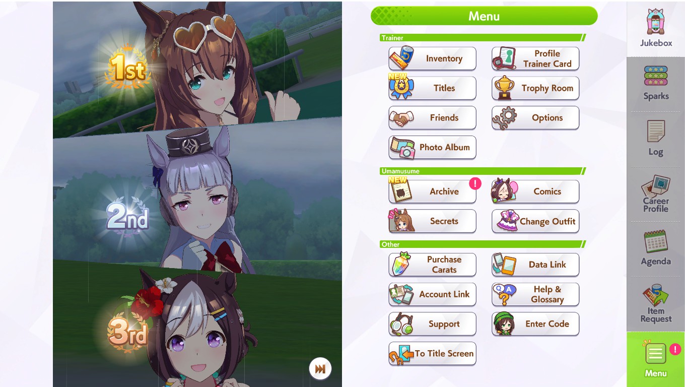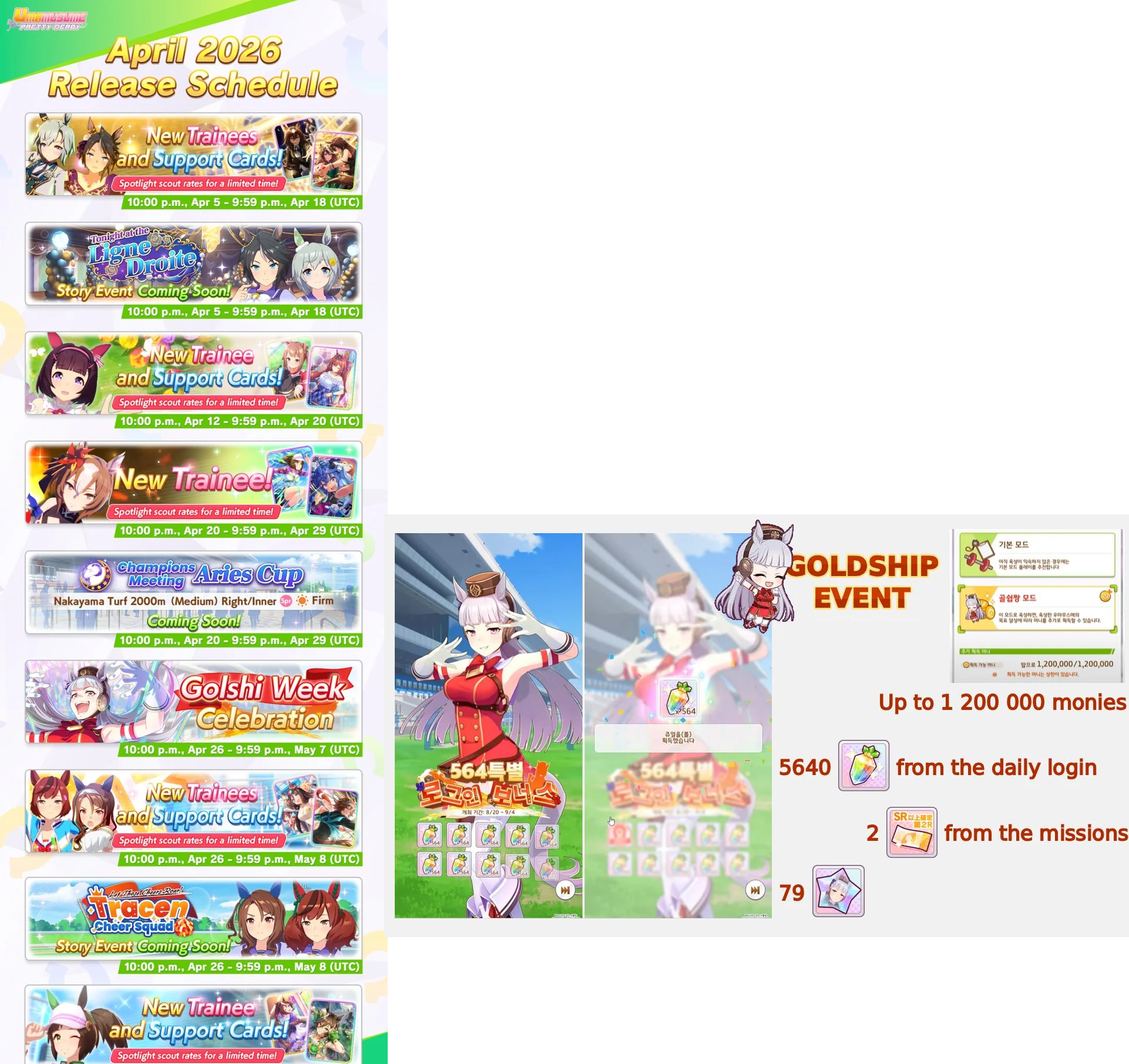 Previous: >>562139480>Global Game NewsLink your account to Cygames iDMain Story Act 1, Finale Part 1 now AvailableCurrent Scenario: Make A New Track aka "Trackblazer"Current Rate Up Trainee: Satono Diamond (3*), Mejiro Bright (3*)Current Rate Up Support Cards: SSR Zenno Rob Roy (Speed), SSR Curren Chan (Wit), SSR Marvelous Sunday (Guts), SR Curren Chan (Speed)Current CM: Pisces Cup - Hanshin Turf 3200m>Schedule03/02 - 04/14 - Halved TP Cost & 2x Career Mode Rewards04/05 - Ballroom Seiun Sky (3*), Ballroom Fuji Kiseki (3*), Symboli Rudolf (SSR), Sirius Symboli (SSR)04/05 - Ligne Droite Story Event04/12 - Nishino Flower (3*), Daiwa Scarlet (SSR), Sweepy (SR)04/20 - Yaeno Muteki (3*), Ines Fujin (SSR), Twin Turbo (SSR)04/20 - Aries Cup - Medium/Right/Spring/Firm/200004/26 - Golshi Week Celebration04/26 - Cheerleader Nice Nature (3*), Cheerleader King Halo (3*), Bamboo Memory (SSR), Seeking the Pearl (SSR)04/26 - Tracen Cheer Squad Story Event04/30 - Ines Fujin (3*), MR. C.B. (SSR), Tokai Teio (SR)https://pages.snep.pw/uma/anni-skill-changes>JP Game NewsCurrent Rate Up: Sakura Bakushin O (3* alt), North Flight (3* alt), SSR Daring Tact, SSR Daring HeartNew Scenario "Beyond Dreams" releasedTimeline: https://uma.moe/timelineCygames Webstore: https://webstore.cygames.com/en/umamusume_en>Thread Clubshttps://rentry.co/umaglobalclublistYou must be E3 (20k points) to join a circle. Apply with /uma/ or /vg/ in your profile or post ID in the thread.>All Guides & Resourceshttps://rentry.org/uma26Game databasehttps://gametora.com/umamusume (Click the gear to switch between JP / global server info)A basic guide for newfagshttps://rentry.org/umaglobalFind networks if your region is blocked from the game or clienthttps://www.umavpn.topSeiyuu & Concertshttps://rentry.org/umstUmamusume Birthday Calendarhttps://ウマ娘.攻略.tools/events/birthdayUma Texthttps://umareader.idsmile.xyzCustom Stickershttps://schizo.farm/resources/stickers