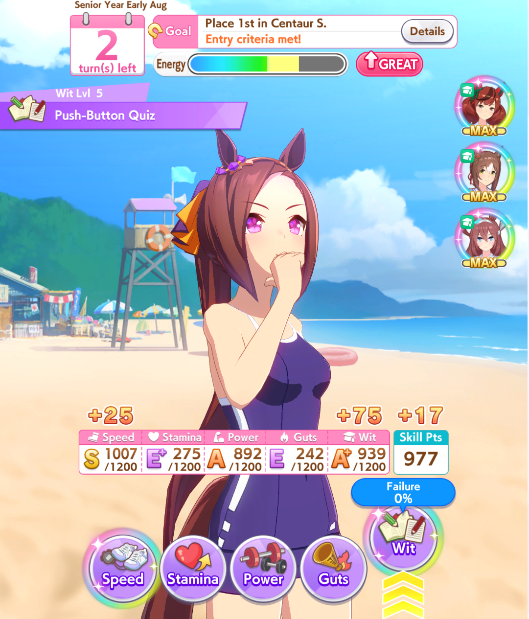 >you need to max wit and speed on maruzen or brick> ok. focus on wit and speed . get stamin and power sparks> she jobs the very wirst g3how is this suppose to work?