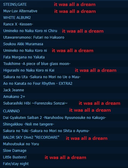 >WHAAAAAAAAAAAAA I DON'T KNOW WHAT TO READ!!!Rance X -Kessen-STEINS;GATEMuv-Luv AlternativeUmineko no Naku Koro ni ChiruFata Morgana no YakataSoukou Akki MuramasaWHITE ALBUM2Umineko no Naku Koro niSubarashiki Hibi ~Furenzoku Sonzai~CLANNADHigurashi no Naku Koro ni KaiUtawarerumono: Futari no HakuoroTsukihime -A piece of blue glass moon-Hentai PrisonSekai Metsubou Kyouyuu Gensou MAMIYA - DoomsDay DreamsFate/stay nightLittle Busters!Higurashi no Naku Koro niEver17 -the out of infinity-RewriteMahoutsukai no YoruSummer Pockets9-nine- Yukiiro Yukihana YukinoatoBALDR SKY Dive2 "RECORDARE"Fata Morgana no Yakata -Another Episodes-Hakuchuumu no AojashinAo no Kanata no Four Rhythm - EXTRA2Dai Gyakuten Saiban 2 -Naruhodou Ryuunosuke no Kakugo-Kara no Shoujo - The Last EpisodeSeaBedSilver Jiken 25 KuIrotoridori no HikariMonmusu Quest! Paradox RPG ChuushouSakura Taisen 2 ~Kimi, Shinitamou koto Nakare~