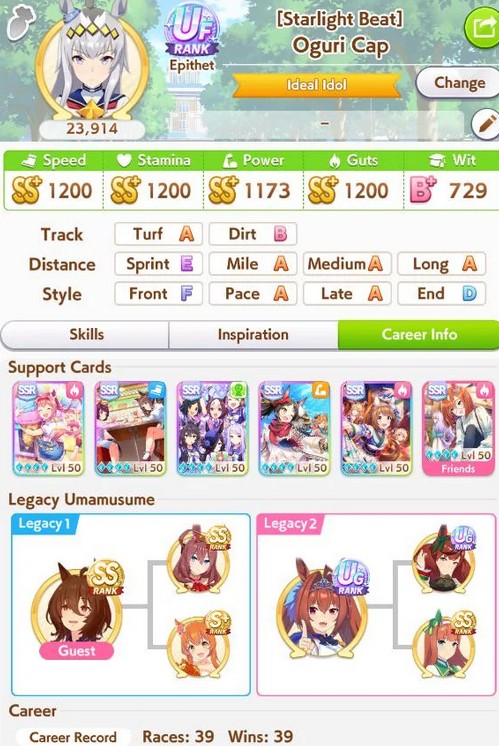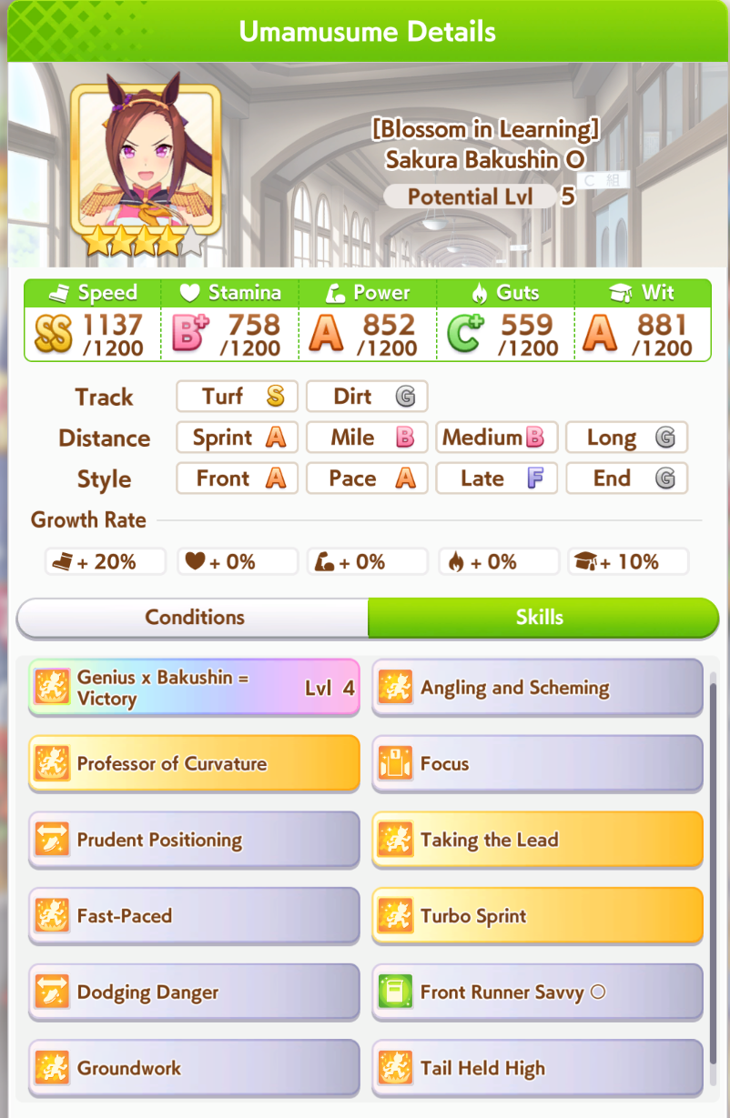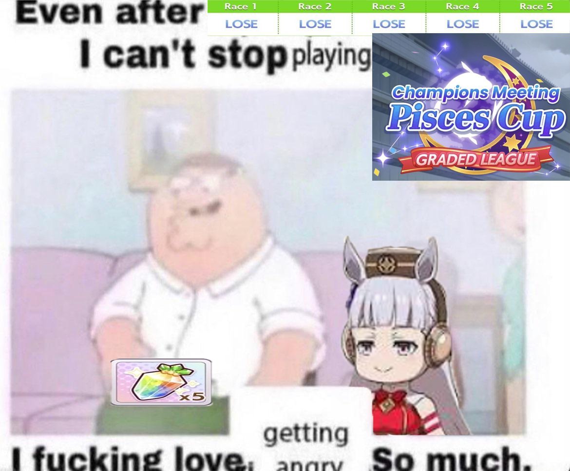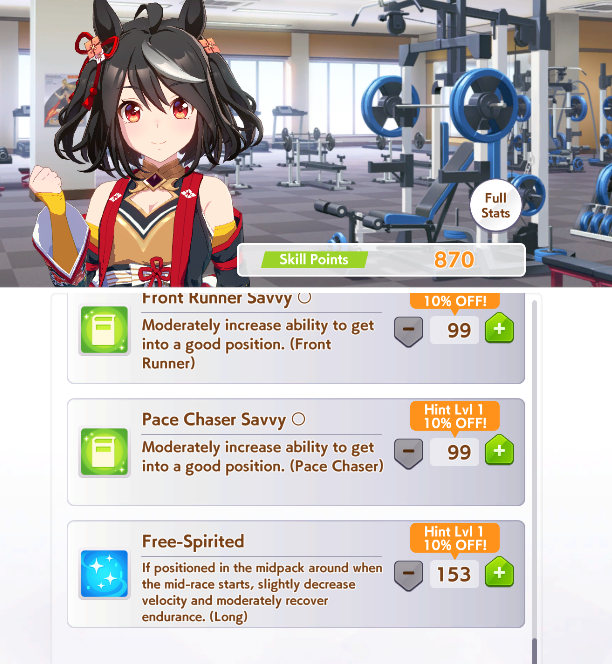 >>5621765601. get 55 or 60% race bonus with cards, make sure to pick something related to your uma's style or the track but get that rb, this is imperative 2. ignore races in junior and before satsuki, get them to orange, after that race race race raceWhy orange? good summers or bust4. all your stats will come from races with 55%, especially 60%, will give you the edge to 600-700 every stat just by soley doing races, with books that 7+s you'll hit 700 in one or two stats, 800 if +15 this does not account summer so that's why you have to get a good summer for the rest5. ignore everything that isn't statpads, energy, hammer and charms, get only 60% megaphones and weights exclusively for summer and TS final, that shit is useless outside and more useless if your summer is shit6. QEII is perfectly ignorable unless everything else is dogshitTL;DR if you get the rb right, luckiness is slightly mitigated, buhis have the upper hand of having good cards. aside from that, everything else is fuck all, just GET THE FUCKING RACE BONUS ALSO IF YOUR SUMMER IS SHIT, ABANDON, DON'T LISTEN TO THE GASLIGHT THAT IF YOUR SUMMER IS BAD YOU CAN STILL SALVAGE IT, NO IT'S NOT SALVAGABLE GOOD SUMMER OR BUST IN ACE RUNS, WHICH IS EVERY RUN unless you're doing parent runs which is go ahead, be free