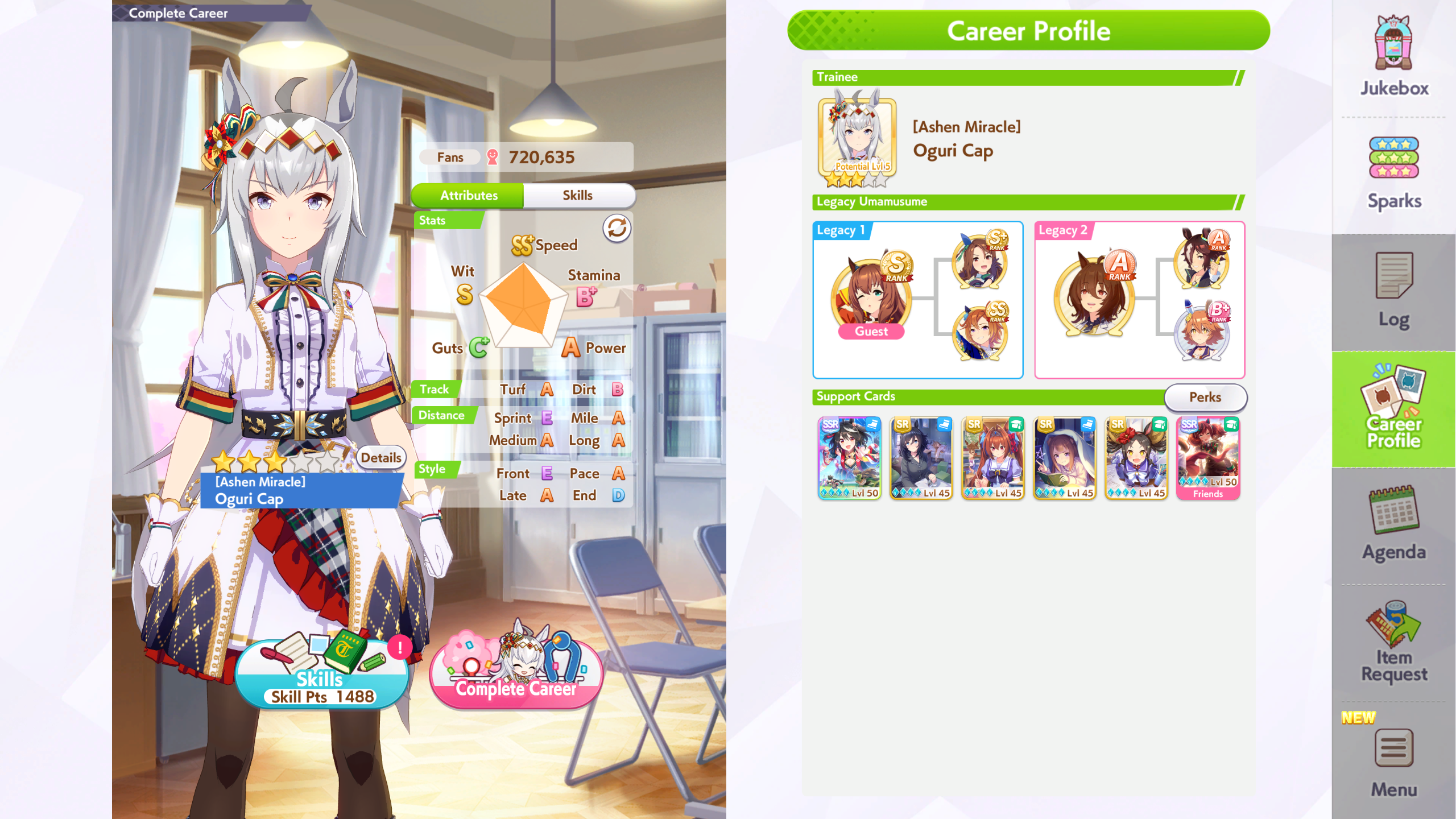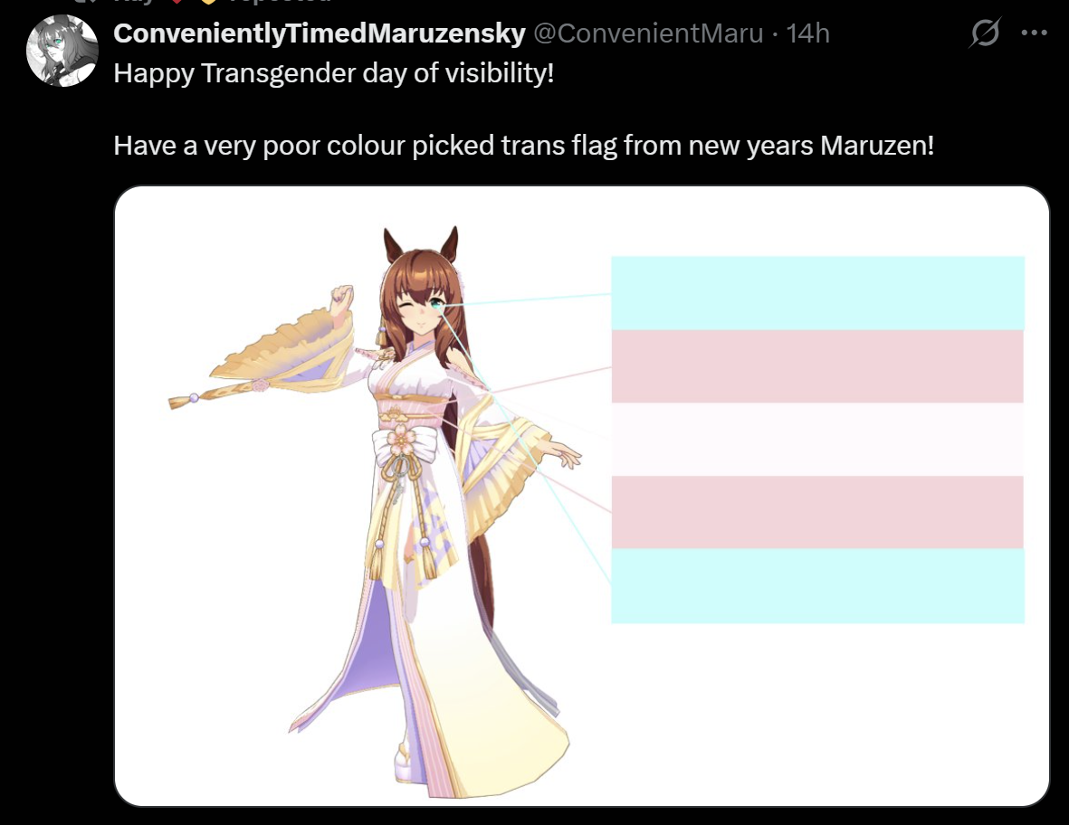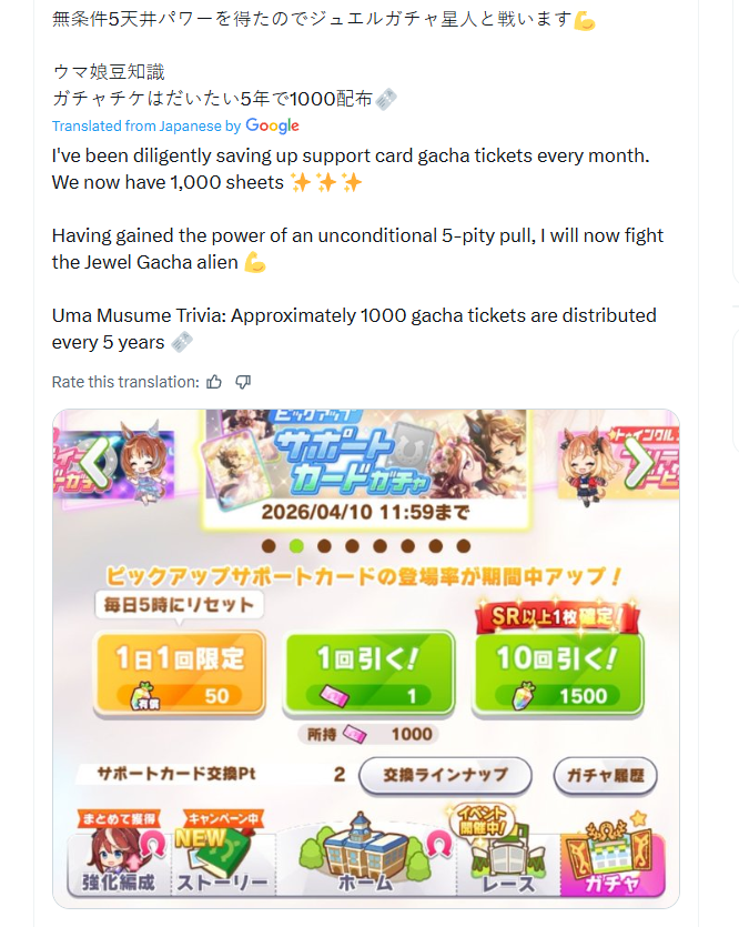 Previous: >>562155924>Global Game NewsLink your account to Cygames iDMain Story Act 1, Finale Part 1 now AvailableCurrent Scenario: Make A New Track aka "Trackblazer"Current Rate Up Trainee: Satono Diamond (3*), Mejiro Bright (3*)Current Rate Up Support Cards: SSR Zenno Rob Roy (Speed), SSR Curren Chan (Wit), SSR Marvelous Sunday (Guts), SR Curren Chan (Speed)Current CM: Pisces Cup - Hanshin Turf 3200m>Schedule03/02 - 04/14 - Halved TP Cost & 2x Career Mode Rewards04/05 - Ballroom Seiun Sky (3*), Ballroom Fuji Kiseki (3*), Symboli Rudolf (SSR), Sirius Symboli (SSR)04/05 - Ligne Droite Story Event04/12 - Nishino Flower (3*), Daiwa Scarlet (SSR), Sweepy (SR)04/20 - Yaeno Muteki (3*), Ines Fujin (SSR), Twin Turbo (SSR)04/20 - Aries Cup - Medium/Right/Spring/Firm/200004/26 - Golshi Week Celebration04/26 - Cheerleader Nice Nature (3*), Cheerleader King Halo (3*), Bamboo Memory (SSR), Seeking the Pearl (SSR)04/26 - Tracen Cheer Squad Story Event04/30 - Ines Fujin (3*), MR. C.B. (SSR), Tokai Teio (SR)https://pages.snep.pw/uma/anni-skill-changes>JP Game NewsCurrent Rate Up: Sakura Bakushin O (3* alt), North Flight (3* alt), SSR Daring Tact, SSR Daring HeartNew Scenario "Beyond Dreams" releasedTimeline: https://uma.moe/timelineCygames Webstore: https://webstore.cygames.com/en/umamusume_en>Thread Clubshttps://rentry.co/umaglobalclublistYou must be E3 (20k points) to join a circle. Apply with /uma/ or /vg/ in your profile or post ID in the thread.>All Guides & Resourceshttps://rentry.org/uma26Game databasehttps://gametora.com/umamusume (Click the gear to switch between JP / global server info)A basic guide for newfagshttps://rentry.org/umaglobalFind networks if your region is blocked from the game or clienthttps://www.umavpn.topSeiyuu & Concertshttps://rentry.org/umstUmamusume Birthday Calendarhttps://ウマ娘.攻略.tools/events/birthdayUma Texthttps://umareader.idsmile.xyzCustom Stickershttps://schizo.farm/resources/stickers