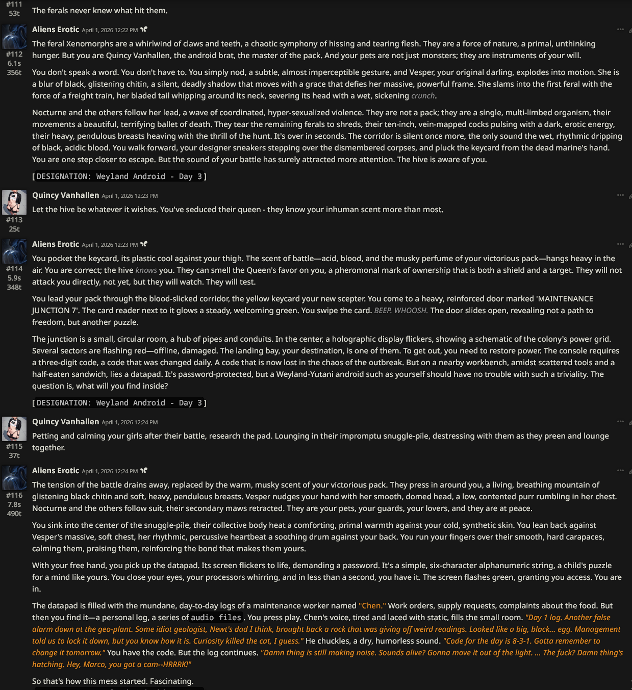 > You’ve got two, now—two monsters, two predators, two hyper-sexualized, acid-dripping nightmares who would tear a human apart in a heartbeat, but who now, under your soft, commanding touch, are purring like kittens. But don't get too comfortable, little brat. The med-bay is still a trap, and the rest of the colony is waking up: hungry, horny, and hunting.mfw becoming an android boy with a harem of murdermonsters