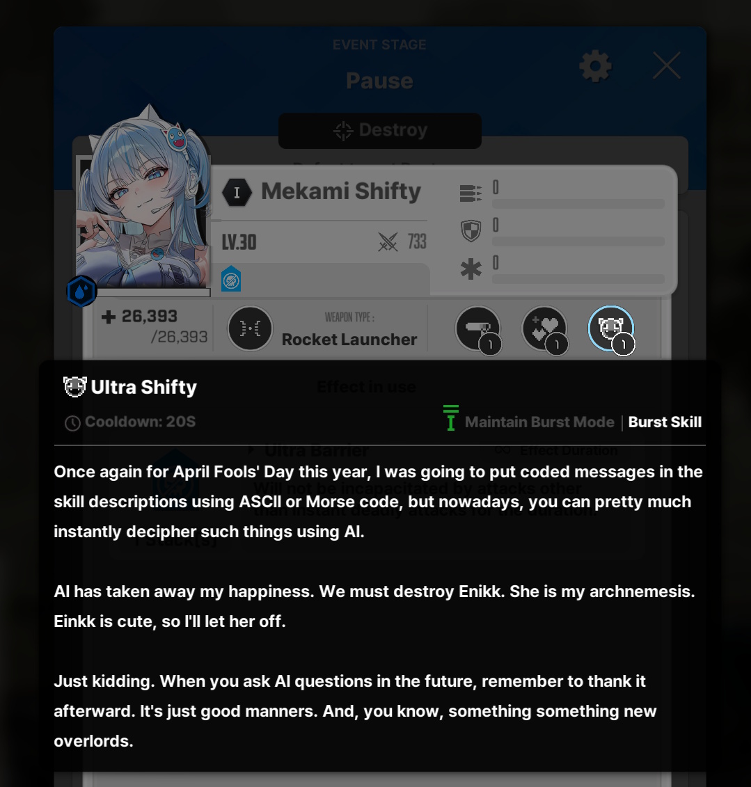 I know this kind of comedy isn't everyone's bag, but I really enjoyed the April Fool's event here. I get that most devs don't want to put a lot of work into something that only lasts a day or two, but I really appreciate what they did. I don't feel so bad about dropping $60 on Privaty-sensei's slutwear now. I also play GFL2 and the April Fool's thing was just a single letter in the mailbox with some bits of loot. How fucking humiliating compared to the show that Nikke put on. I also play GFL1 and they didn't do anything, but that's expected since the game will probably be shut down as soon as some executive is having a bad day.