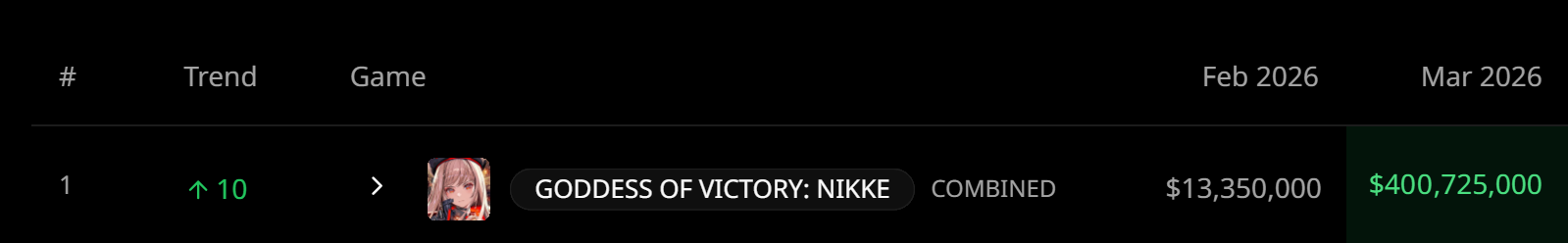 If must take those numbers at face value, then March and April are always low spending months, and Nikke actually improved by a million compared to last March.