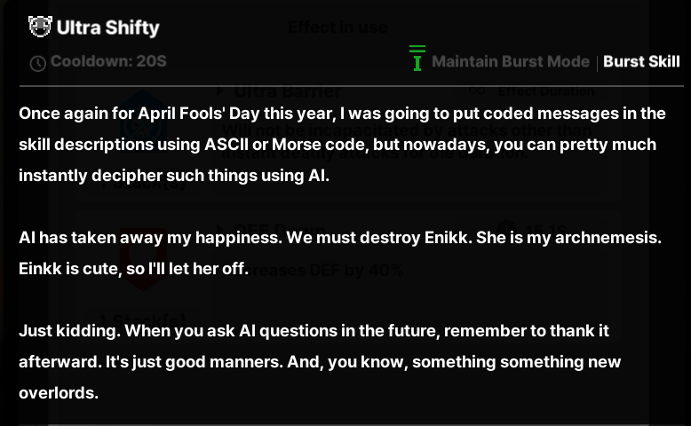 >>562190894seems like KR gachas put more effort into the whole aprils fool thing. i also enjoyed the event a lot, made me laugh