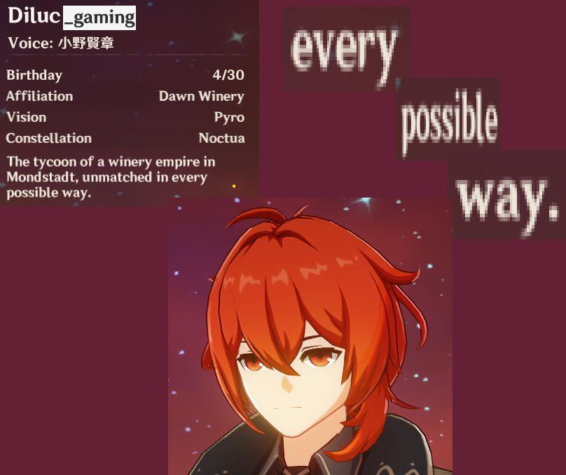 Gosh...all I can think about is Diluc...*sigh*
