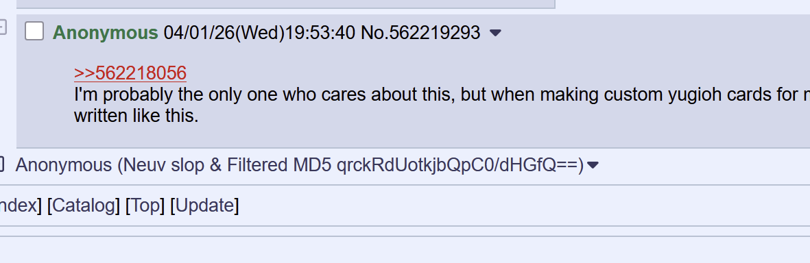 >>562218056I'm probably the only one who cares about this, but when making custom yugioh cards for memes at least put in the effort to give them the proper problem solving card text. If a card with such an effect existed it wouldn't be written like this.