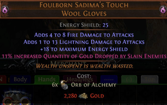 >>562212206The Bandit Lord's Band Gold Ring 44 Item sells for much more to vendors(25-35)% increased Quantity of Gold Dropped by Slain Enemies Foulborn Goldwyrm ((20-30)% increased Quantity of Gold Dropped by Slain Enemies) Foulborn Aurseize (15% increased Quantity of Gold Dropped by Slain Enemies) Foulborn Sadima's Touch ((5-15)% increased Quantity of Gold Dropped by Slain Enemies)