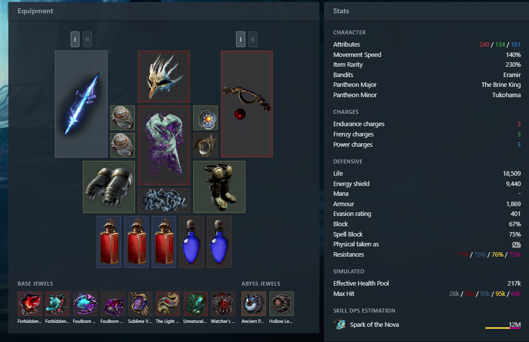 >>562306049I've got more than skill forbidden jewels and headhunter, I rarely die now, except for the most juiced maps.My PoB says inf effective hit points if I decide to dabble with recoup life and Physical-to-Fire damage conversion, but i don't have to currency to go that direction and you're still dead if you get hit once by a boss.If you go for the forbidden jewels, you are using a warstaff try safeguard block master and the nearby serpent stance nodes for huge block boost. use the corded belt for an additional anoint if you don't want to use headhunter or don't have mageblood. I've got 92-94% when more than skill procs. 200-400div buy in though and there's almost certainly better builds out there.