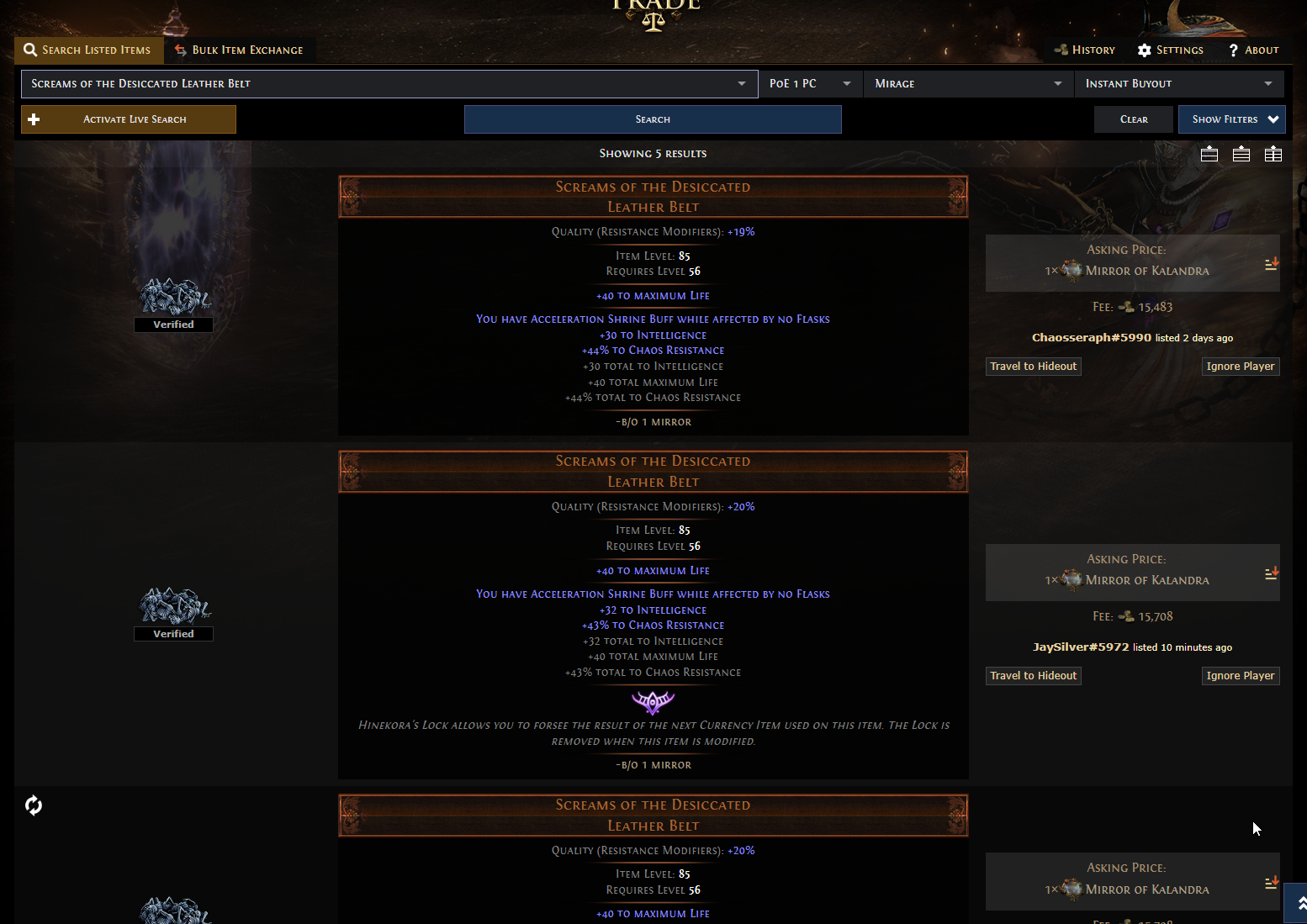 >>562206794>20600 for 20 barya>12 belts return ( sell 2100 chaos ea = 25200 chaos)>19700 chaos for 20 barya>12 belt return (sell 2100 chaos ea = 25200 chaos)Don't buy them then. Don't run the easiest boss in the game that has a 55% chance at least to drop his 2K+ chaos belt unidi dont care im mainly bragging not giving you advice
