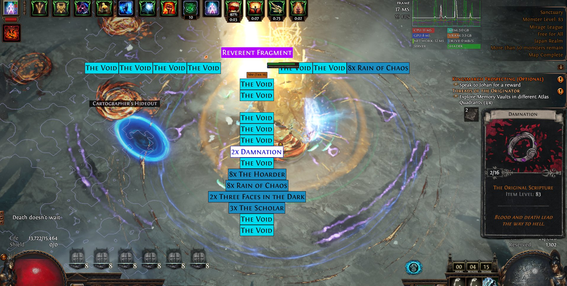 >>562212580for essences if your build is not tanky or dps heavy dont take the node that gives the map boss essences, for blight same thing with blight bosses in lanes anoint your rings with ice and fire pilons check the wiki i personally go for minions, i usually combo harvest and blight on the atlas tree but essences are alright i guess make sure you have a bunch of vaal orbs and corrupt essences to transform them to higher tiers. use scarabs for essences maybe not for blight they seem quite bad for blight for some reason.