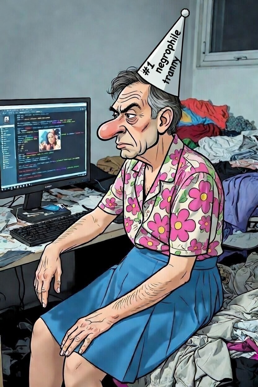 >>562237237>>562237516>grok, generate me an image of this guy, he's an ugly 50 yo crossdressing faggot from canada, he stays every single day posting on 4chan about being a fag. generate what he must look like, and put a dunce cap on top of his ugly head saying "#1 negrophile tranny"this u fag?
