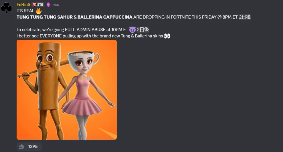 >Tung Tung Tung Sahur and Ballerina Cappuccina are set to release in the Fortnite Item Shop on Friday at 8 PM ET!