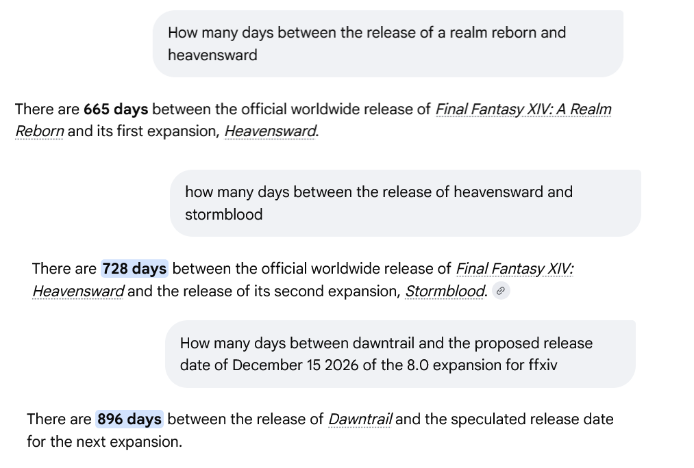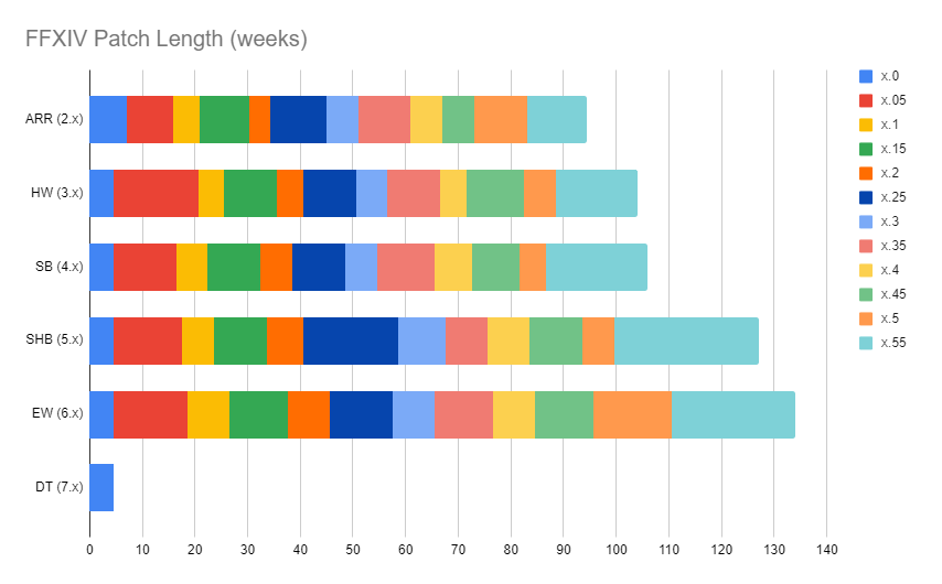 >>562260525They've already made official the 4 month patch cycles after covid and even then they've already said that they've ran out of time to implement shit throughout DT like FT normal. 7.0 > 135 day patches * 5 patches + 6 months > 8.0, this is the usual schedule outside of extraordinary conditions like how DT had the graphics update and had to suffer a delay.ShB had covid delays but the 4 month patch cycle wasn't official back then, though even then we never had a real 90 day patch outside of a single one way back during ARR, patches were usually 110-120 days despite everyone saying "3 month patch cycle".