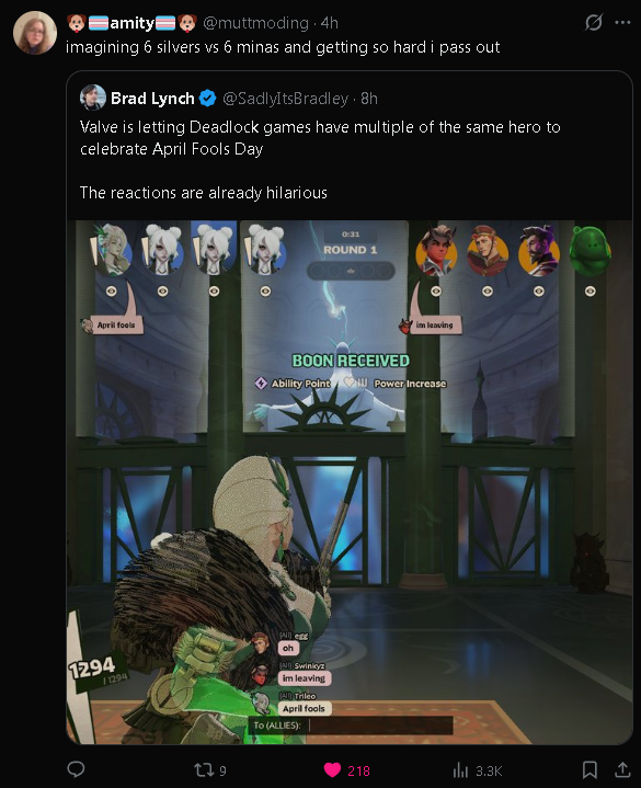 >When the April fools event improves the gameLol at the people seething about this on the deadlock discord