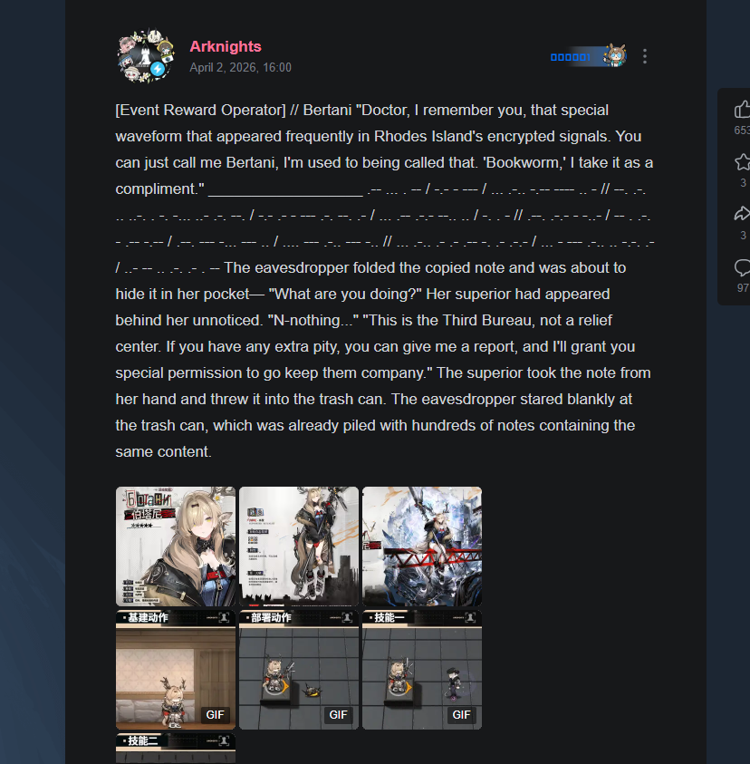 Previous thread: >>562238712Happy birthday to April!>CURRENT, FUTURE GLOBAL/JP/KR CONTENT:[3/27-4/10][Standard]6* Sniper Pozemka, 6* Defender Jessica the Liberated (Shop), 5* Sniper Melanite, 5* Medic Record Keeper, 5* Supporter Quercus (Shop)[3/19-4/2]EP16: Abnormal Spectrum - Windscoot skin[3/19-4/2][The Silent Wavelengths]6* Caster Mantra, 5* Vanguard Poncirus, 5* Defender Vetochki, 4* Vanguard Snegurochka[3/18-4/2][Storyboard Breaker]Narantuya, Mitm, Greyy The Lightningbearer, Haze[4/1-4/22]Icebreaker#2 - Chiave skin[4/1-4/15][Joint Operation]6* Sniper Narantuya, 6* Guard Degenbrecher, 6* Sniper Lemuen, 6* Caster Ho'olheyak, 5* Vanguard Mitm, 5* Specialist Wulfenite, 5* Supporter Grain Buds, 5* Sniper Lunacub, 5* Caster Santalla, 5* Sniper Greyy the Lightningbearer>CURRENT, FUTURE CN CONTENT:[3/26-4/9][Standard]6* Supporter Stainless, 6* Sniper Ray (Shop), 5* Sniper Kichisei, 5* Defender Bassline, 5* Caster Santalla (Shop)[3/27-4/10]When Elegies Are Ashes - Brigid skin[3/27-4/10][Returned From A Pyre]6* Caster Necrass, 5* Specialist Wulfenite, 5* Defender Firewhistle[TBA][Ambiance Synesthesia]Lemuen, Necrass, Saria>/akg/ website:akgcc.github.io>AK EN Database:puppiizsunniiz.github.io/AN-EN-Tags/akhrchars.html>More valuable resources:rentry.org/akg_resources>/akg/ merch guiderentry.co/akg_merch