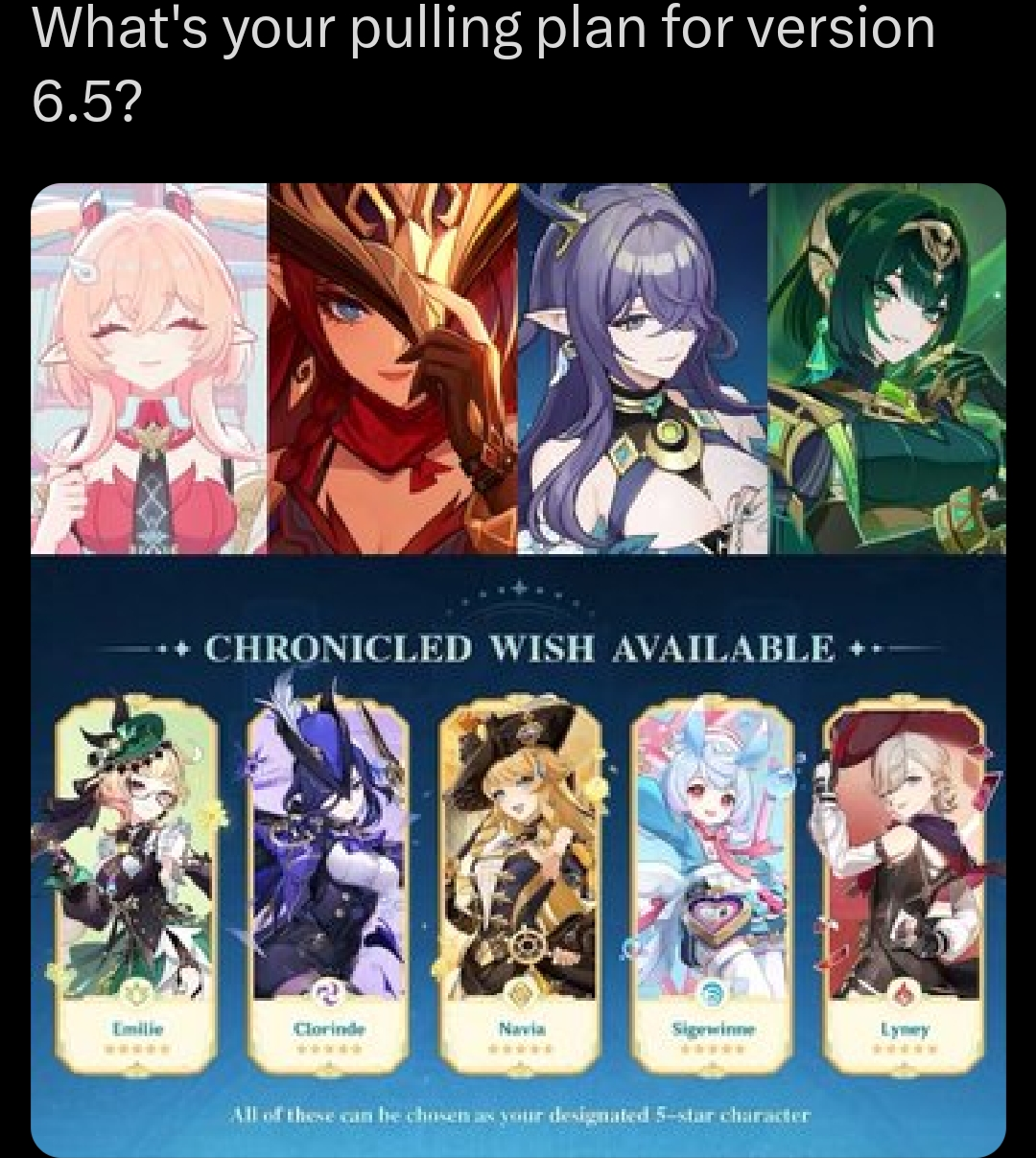 Who should I pick? I was thinking Shenhe because I do use her in my Skirk team, but I feel like she is going to be obsolete in a few months with Snezh units coming. Then again the alternative would be a Stella Fortuna or Cheld C1