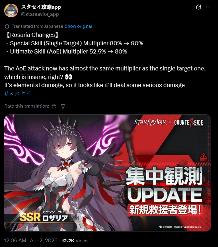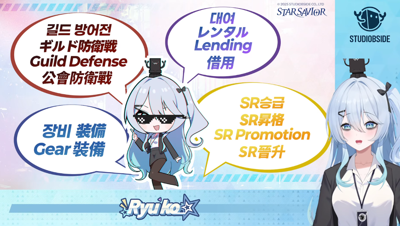 >Star Savior is a new game by Korean studio BSide, the developers of CounterSide. It's a 3D turn-based fantasy RPG with training gameplay. It features an all-female cast, optional PvP and is voiced in Korean and Japanese.>Useful Links and Beginners FAQhttps://rentry.org/ssgguidehttps://kanohban.github.io/StarSaviorArcanaDB/https://docs.google.com/spreadsheets/d/1W1nl3zfBdrgNCjLCVt7lBn0UzuwPLVnF2JkC4iamRic/edit?gid=1473713484#gid=1473713484https://tychara.com/StarSavior>Downloadhttps://store.steampowered.com/app/3609080/StarSavior/https://play.google.com/store/apps/details?id=com.studiobside.starMainhttps://apps.apple.com/app/id6443597557>Resethttps://time.is/1900+UTC>Banners[02.04. - ??.??.] SSR Rate Up - Rosaria[19.03. - 01.04.] SSR Rate Up - Yoo Mina[19.03. - 01.04.] SSR Rate Up - Hilde[19.03. - 14.04.] Special Featured Observation (Post KR/JP launch Saviors/Arcana)>Events[19.03. - 08.04.] Vestige of Corruption I - The Monologue Must End (CounterSide Collaboration)https://www.youtube.com/watch?v=ja8yRx3zf3A>Daily Check In- Special Welcome (SSR selection, SSR Trish)- New Savior Party (14 days, SSR Frey, tickets each day)- Lavistar Settlement (21 days, SSR random box)>Guilds:ScarcityLummiesLuckletsHildfriendsHuldraPrevious:>>562248041