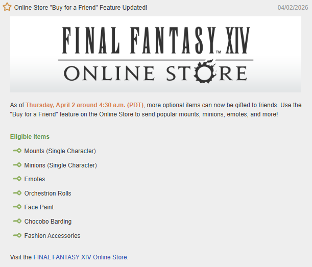 Good Thread Edition>Moogle Treasure Trove - (March 31st -> Release of Patch 7.5)https://na.finalfantasyxiv.com/lodestone/special/mogmog-collection/202603/lba1j4i815>Patch 7.45 Noteshttps://na.finalfantasyxiv.com/lodestone/topics/detail/2e8a10c44121af50ce86e1b605e10608e15f24d6>Hatching Tide (March 23rd - April 6th)https://na.finalfantasyxiv.com/lodestone/special/2026/Hatching_tide/wgtbl3kgc5>Resourceshttps://rentry.org/xivgresources>Meetups• April 1, 9:00 PM EDT | Primal, Famfrit, Lavender Beds W15 P20 | Spooky Club: X-files (It's over edition) >>561943017 (Cross-thread)• April 3, 9:00 PM EDT | Crystal, Mateus Mist W24 P3 | xivg orgy meet >>562105254 (Cross-thread)• April 4, 8:00 PM EDT | Dynamis, Golem | New Alt FC >>561137994• April 19th, 16h (4pm) CEST | Light, Lich, Empyreum, W7 P48 | Frenchra movie: Pulp Fiction >>561912764 (Cross-thread)• April 13th, 8:00 PM EDT | Primal, Exodus | Empyreum, Ward 26 Plot 34 | Homestuck Meetup >> 562037876Previously on /xivg/: >>562275436