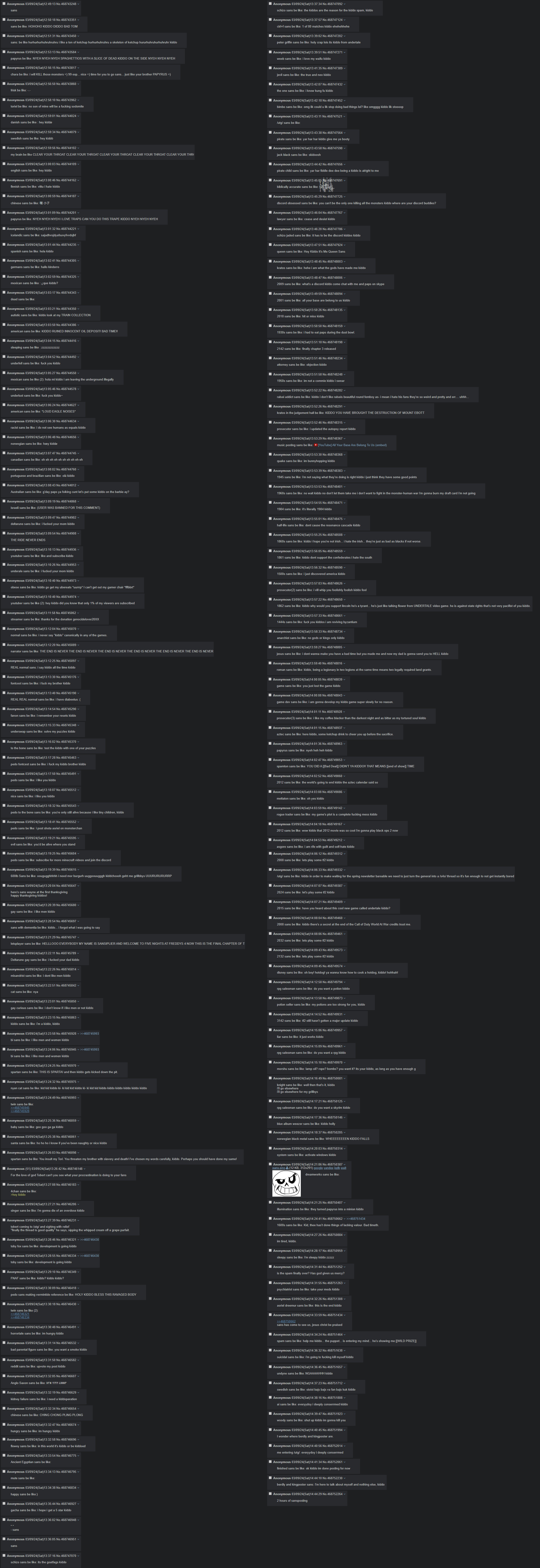 CHAOS! CHAOS! EDITIONPREVIOUS CHAOS: >>562255898SPOILERS AHEAD, PROCEED AT YOUR OWN FRISK.-THE NEW, NEW GAME!>https://store.steampowered.com/app/1671210/DELTARUNE/>https://deltarune.com-THE OLD, OLD GAME>https://undertale.com-The Old Game's Demo>https://undertale.com/demo-THE DOG'S STEADY STROLL BEGINS TO WAVER>https://toby.fangamer.com/newsletters/>https://deltarune.com/#news>https://web.archive.org/web/20240815033908/http://www.twitlonger.com/show/n_1sqn3p9-PURCHASE A CONFECTIONERY>https://www.fangamer.com/collections/undertale>https://www.fangamer.com/collections/deltarune-MORE FOR ME, ME!>https://undertaleqa.tumblr.com>https://undertale.com/alarmclock>https://deltarune.com/sweepstakes/-THEY WATCH, WATCH YOU! CAN'T YOU HEAR THEM LISTENING?>https://pastebin.com/WG9u1fvH-THE PAST IS A DISTANT PLACE. LET THESE WORDS GUIDE YOU AND YOU MAY CATCH A GLIMPSE>https://pastebin.com/g2JqH6Ba>https://utg.vidya.pics/-TAKE AN EAR, FOR WE HAVE MUCH TO SHARE>https://pastebin.com/fsqd5Sa6-THE WRITING PAGES>Current: https://docs.google.com/document/d/1ZaYVvltQ_Rmf-ggszf1bwmYDW2NUcfpTYU7JzfyMhVE>Old: https://writebin.surge.sh-THE WATCHING PAGES>https://pastebin.com/UJpBYSEE-GAMES, GAMES!>https://archive.is/iSiFg-IT'S RIGGED I TELL YOU! RIGGED!>https://implyingrigged.info/wiki//utg/-EMBRACE CHAOS>https://rentry.org/utg-font-THE MADMAN PAINTS HIS FACES>Current: https://r8.whiteboardfox.com/87031452-9445-6936>Previous: https://r8.whiteboardfox.com/87014223-3106-4870>Current: https://magma.com/d/3B5chWd0Vh>Previous: https://magma.com/d/QiFH9rWyRh-AN ABANDONED BOX OF TOYS. OH, IT REMINDS ME SOMETHING OF MYSELF>https://utg-pippins-ocs.neocities.org-CONTINUE THE CRIME SPREE! UEE HEE HEE! (paste the current whiteboard links)>https://pastebin.com/rTN8SxAw