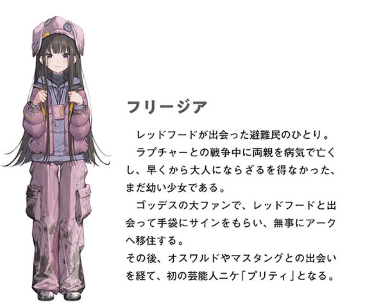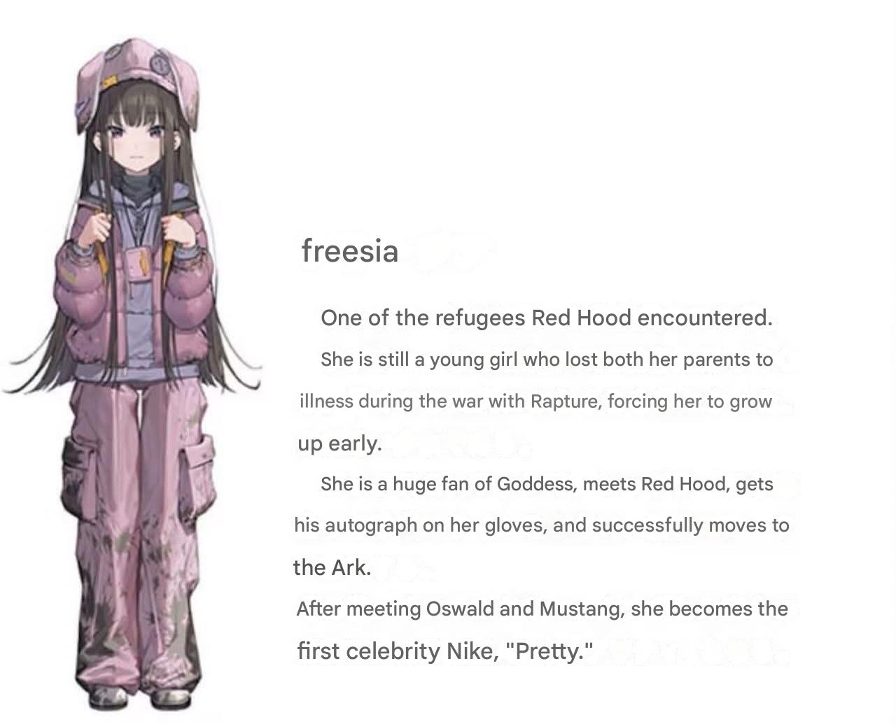 >>562297985>Red Hood saves Freesia>Freesia imprints onto Oswald>Oswald adopts her and takes her to the Ark>Freesia eventually becomes Pretty>Pretty is murdered and DEEP turns her core into a weapon>Enikk goes on a rampage because of this and lobotomizes DEEP>Sixo is born from Enikk's rage and the Outer Rim is created by the Judges who adopted Sixo>Rapi meets Red Hood, Neon is rescued from the Outer Rim, and Anis inherits Pretty's core