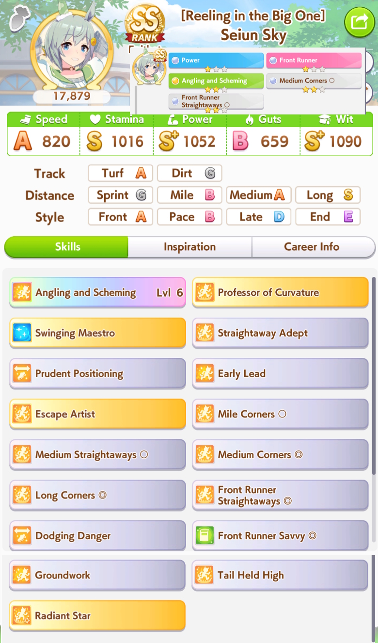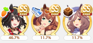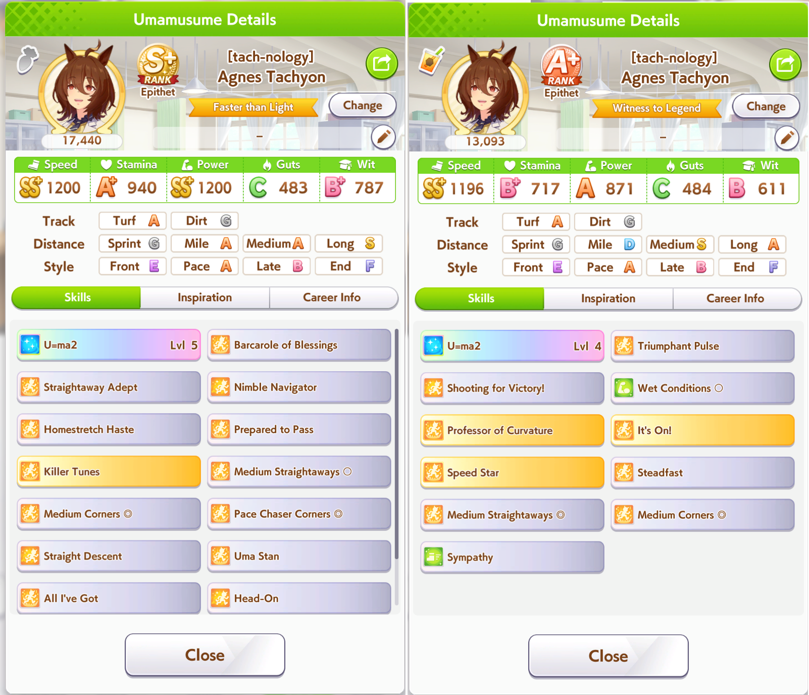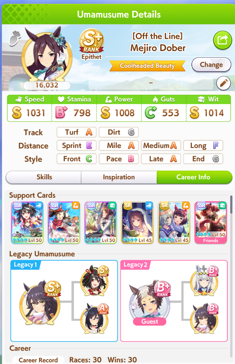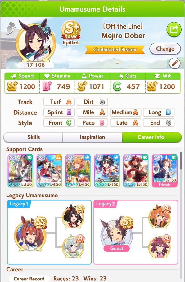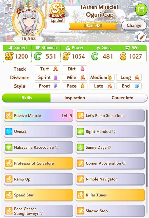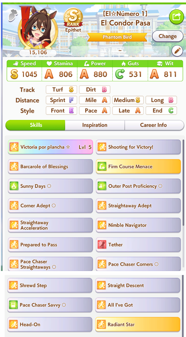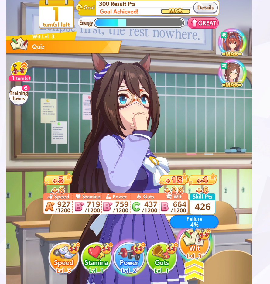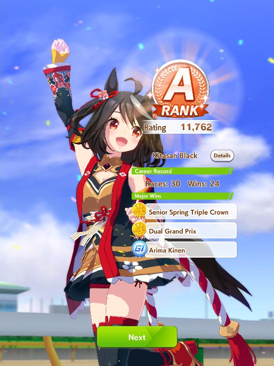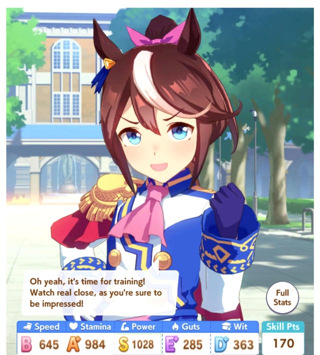 >>562298892>>562298927>>562298927My parents suck so my Kitasan often suffers from either low stam or low strength so I haven't been able to get her to S rank, fell behind with the team sirius card and the rng wasn't good on both summer events, ended up with Kita having +B and C skills by the end of senior year. Somehow she still won the twinkle series.