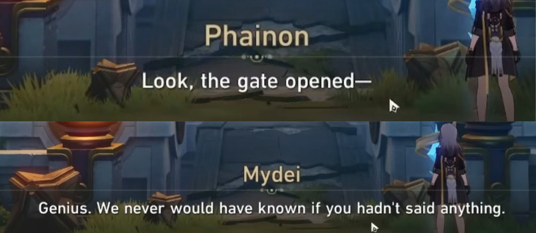 >>562304061>Playing Genshin is like permanently being stuck in Amphoreus but with actually great story and characters, fantastic gameplay, great lore and world building, much better dialogue and great memorable main events and also actually fun endgame*FTFY