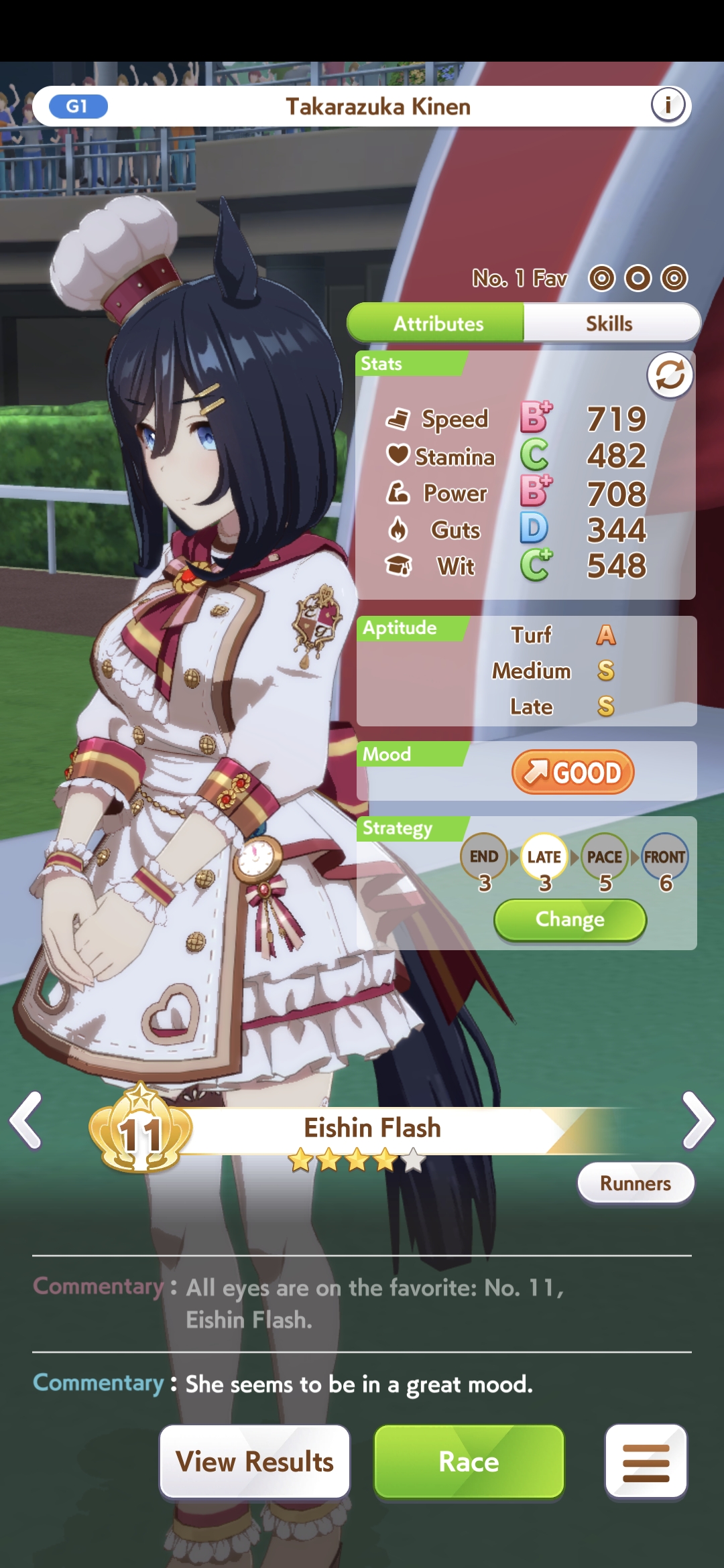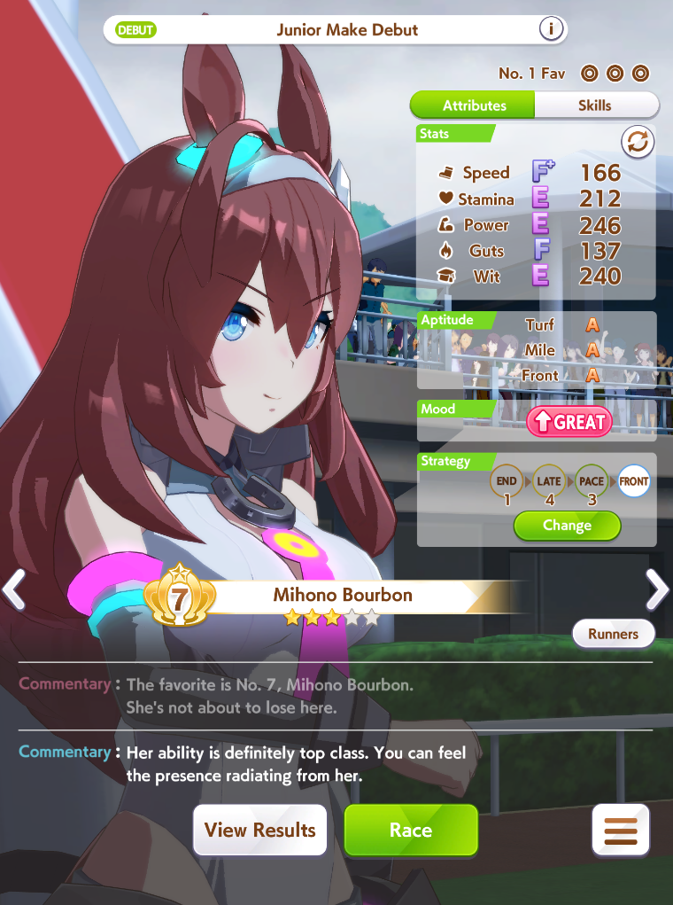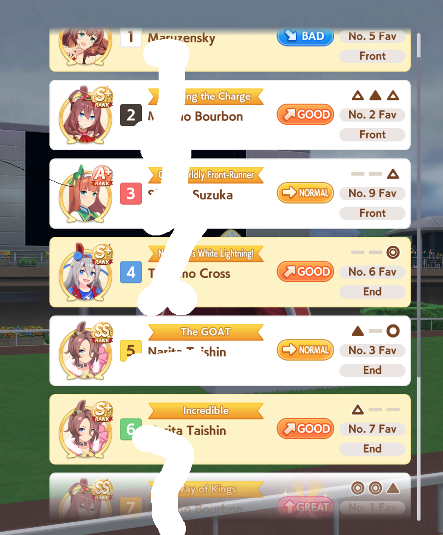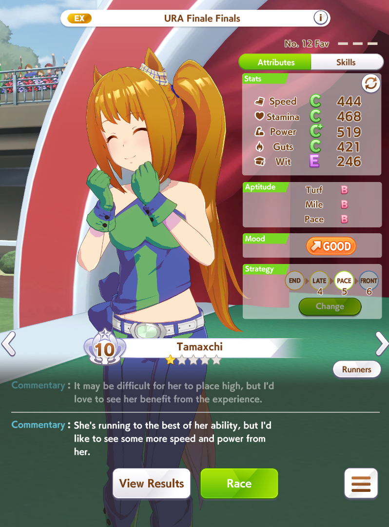 aghhh c'mon, give tam great mood for once. I swear to umagod she has gotten BAD 70% of all races. Including these 4. My taishin can't win shit ever. S.m carrying me to A.. plz