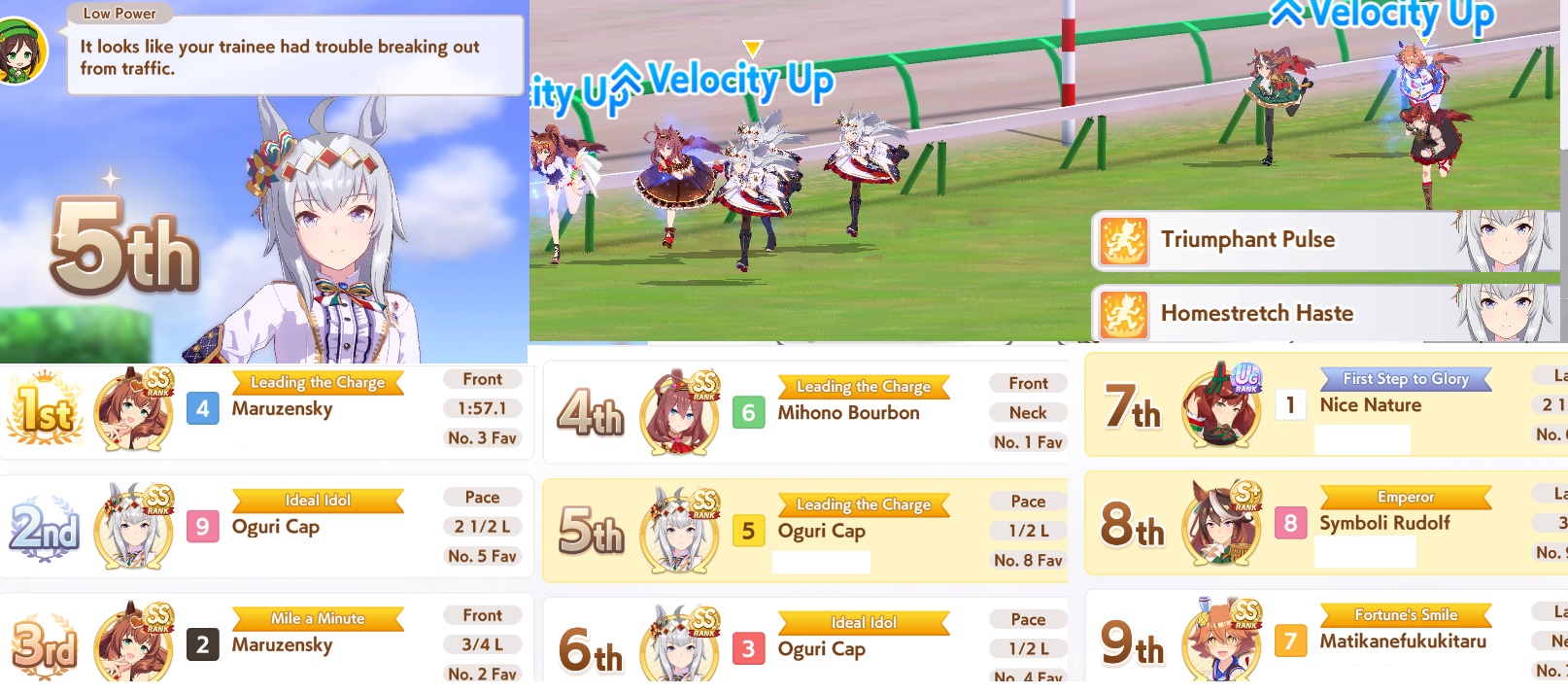 >Base Oguri pace with 923 stam, 503 guts, 1 gold and 2 white recoveries in room with 3 frontrunners stretching the midrace has enough stamina to winim so confusedis that really enough?