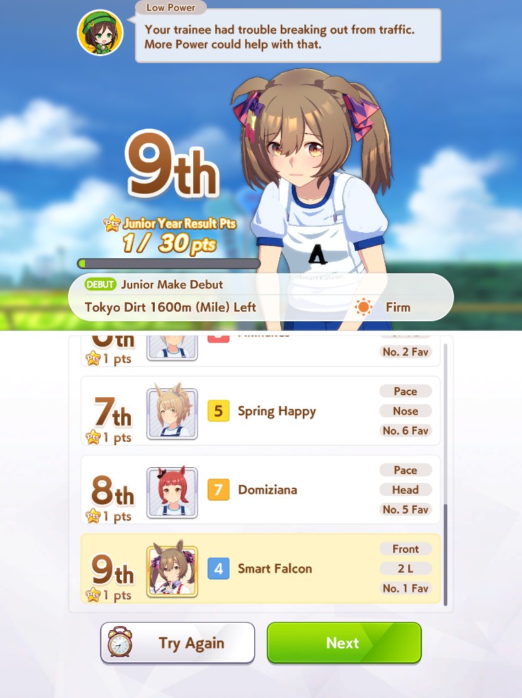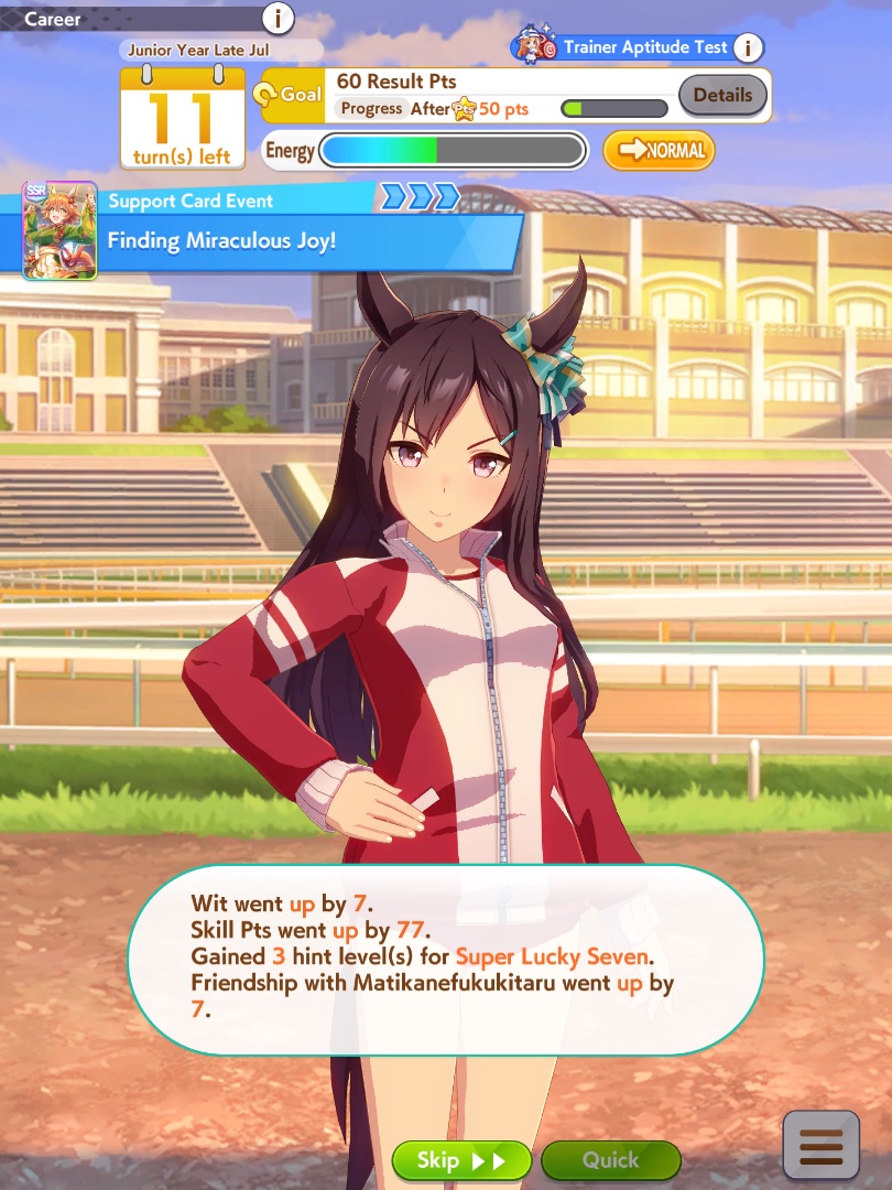 >>562317406My Gold Shit randomly decided to job Classic Mile Championship 3 times in a row and leaving me with no clocks, finishing 6-7th in every attempt, despite having good stats, A mile and skills (Spurt, THH combo)She finished career with 33/34 win rate.End Closers really fucking annoy me. Narita Taishin is going to kill me.