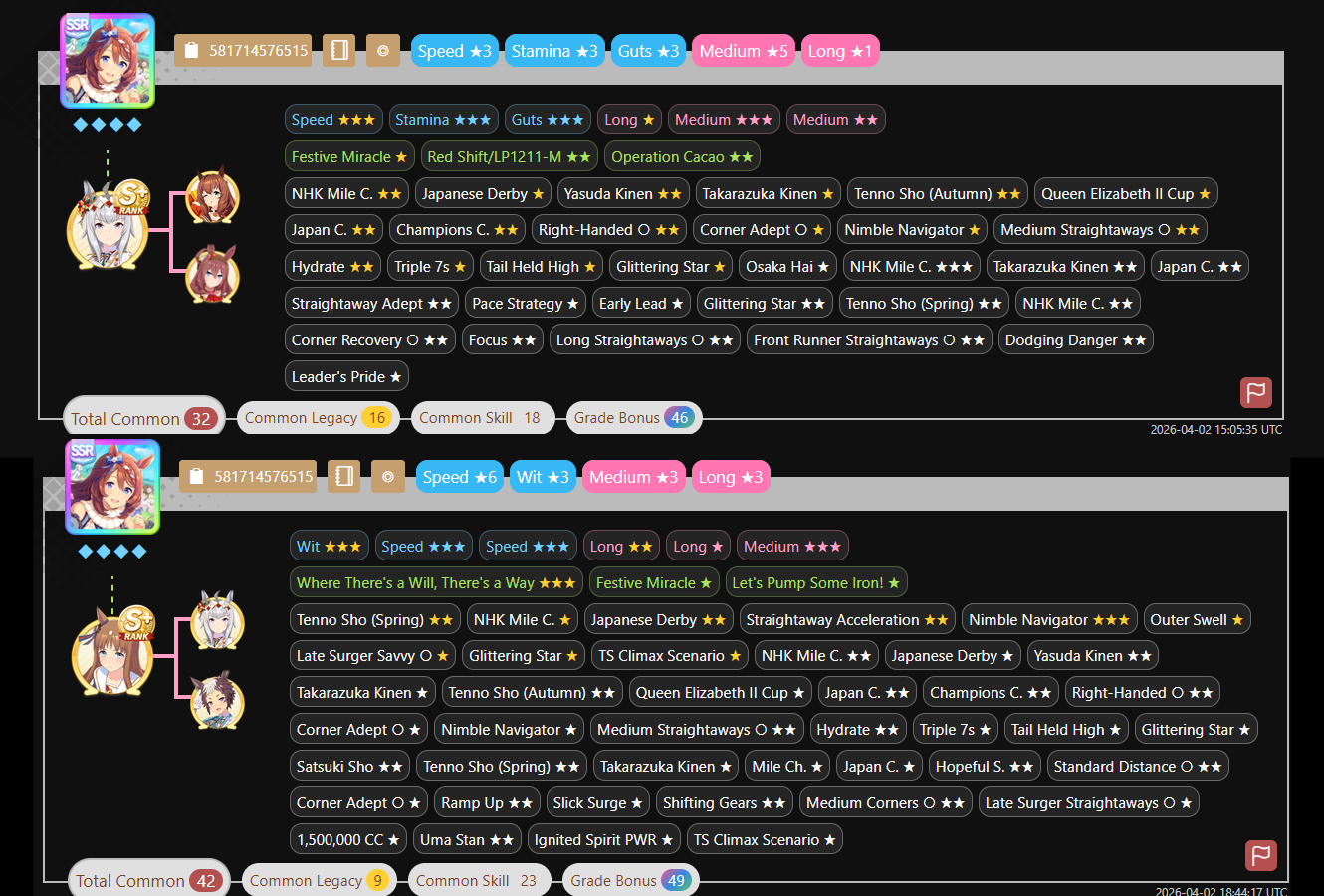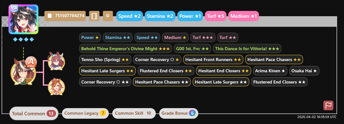 Previous: >>562297135>Global Game NewsLink your account to Cygames iDMain Story Act 1, Finale Part 1 now AvailableCurrent Scenario: Make A New Track aka "Trackblazer"Current Rate Up Trainee: Satono Diamond (3*), Mejiro Bright (3*)Current Rate Up Support Cards: SSR Zenno Rob Roy (Speed), SSR Curren Chan (Wit), SSR Marvelous Sunday (Guts), SR Curren Chan (Speed)Current CM: Pisces Cup - Hanshin Turf 3200m>Schedule03/02 - 04/14 - Halved TP Cost & 2x Career Mode Rewards04/05 - Ballroom Seiun Sky (3*), Ballroom Fuji Kiseki (3*), Symboli Rudolf (SSR), Sirius Symboli (SSR)04/05 - Ligne Droite Story Event04/12 - Nishino Flower (3*), Daiwa Scarlet (SSR), Sweepy (SR)04/20 - Yaeno Muteki (3*), Ines Fujin (SSR), Twin Turbo (SSR)04/20 - Aries Cup - Medium/Right/Spring/Firm/200004/26 - Golshi Week Celebration04/26 - Cheerleader Nice Nature (3*), Cheerleader King Halo (3*), Bamboo Memory (SSR), Seeking the Pearl (SSR)04/26 - Tracen Cheer Squad Story Event04/30 - Ines Fujin (3*), MR. C.B. (SSR), Tokai Teio (SR)https://pages.snep.pw/uma/anni-skill-changes>JP Game NewsCurrent Rate Up: Sakura Bakushin O (3* alt), North Flight (3* alt), SSR Daring Tact, SSR Daring HeartNew Scenario "Beyond Dreams" releasedTimeline: https://uma.moe/timelineCygames Webstore: https://webstore.cygames.com/en/umamusume_en>Thread Clubshttps://rentry.co/umaglobalclublistYou must be E3 (20k points) to join a circle. Apply with /uma/ or /vg/ in your profile or post ID in the thread.>All Guides & Resourceshttps://rentry.org/uma26Game databasehttps://gametora.com/umamusume (Click the gear to switch between JP / global server info)A basic guide for newfagshttps://rentry.org/umaglobalFind networks if your region is blocked from the game or clienthttps://www.umavpn.topSeiyuu & Concertshttps://rentry.org/umstUmamusume Birthday Calendarhttps://ウマ娘.攻略.tools/events/birthdayUma Texthttps://umareader.idsmile.xyzCustom Stickershttps://schizo.farm/resources/stickers