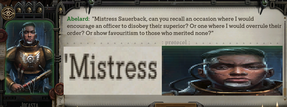 >>562367969You watch too much porn if that's your reaction to thatAbelard calls you master when he comes to meet you after you see the Warrant of Trade, which is before you're a Rogue Trader. He uses honorifics and words like master and mistress in a non-sexual way