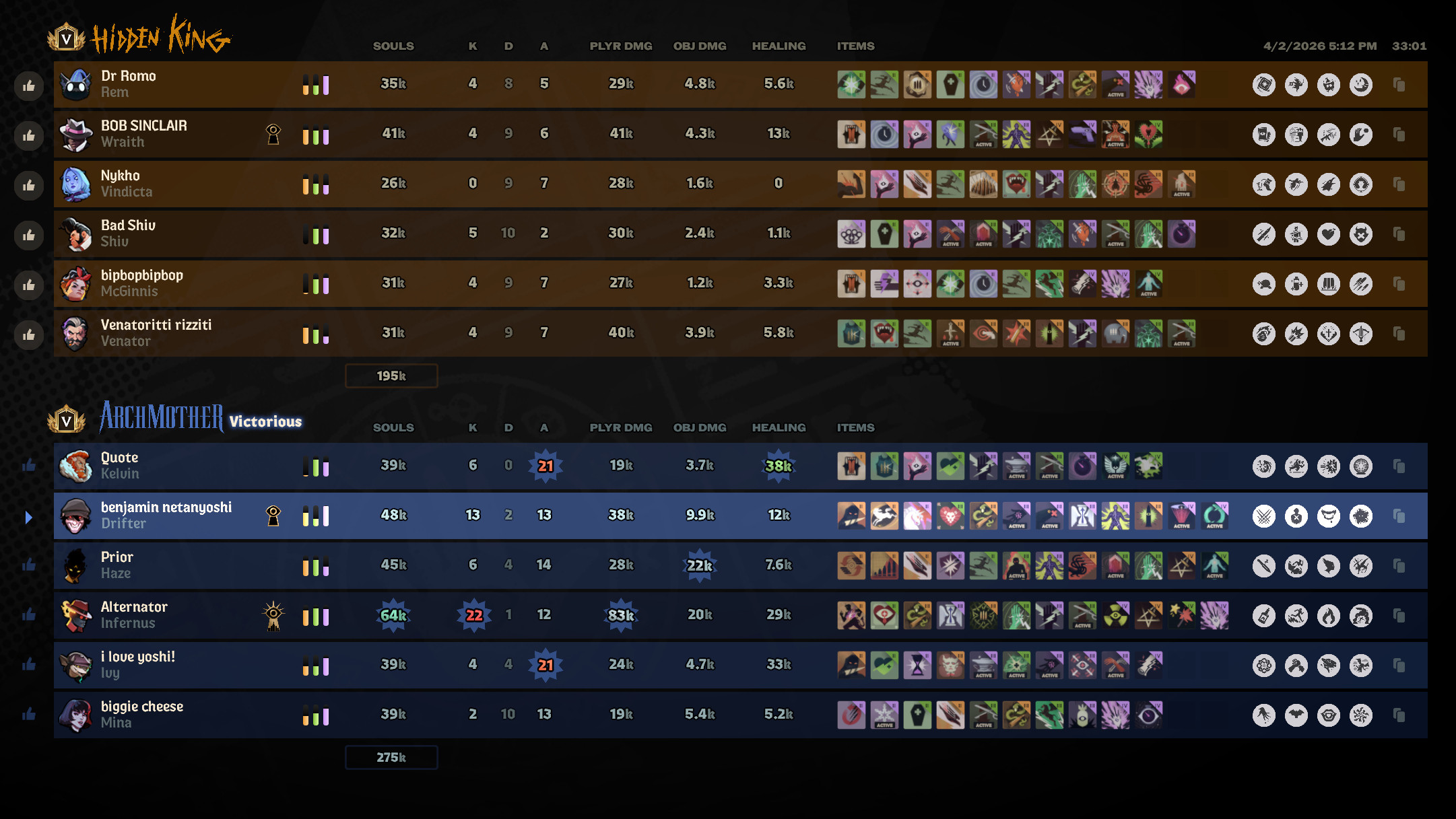 >>562374482>32k souls Rem, over 10k souls ahead the second highest net value player with trophy collectorI hate Rem players so much. I bet he bought egg first item, ran around stealing every sinners (including his team's) and then used everything to buy a bunch of damage items for his pillow. Not a single fucking active. And then he lost. 90% of Rem players for some reason play him like an AFK carry, its utterly bizarre