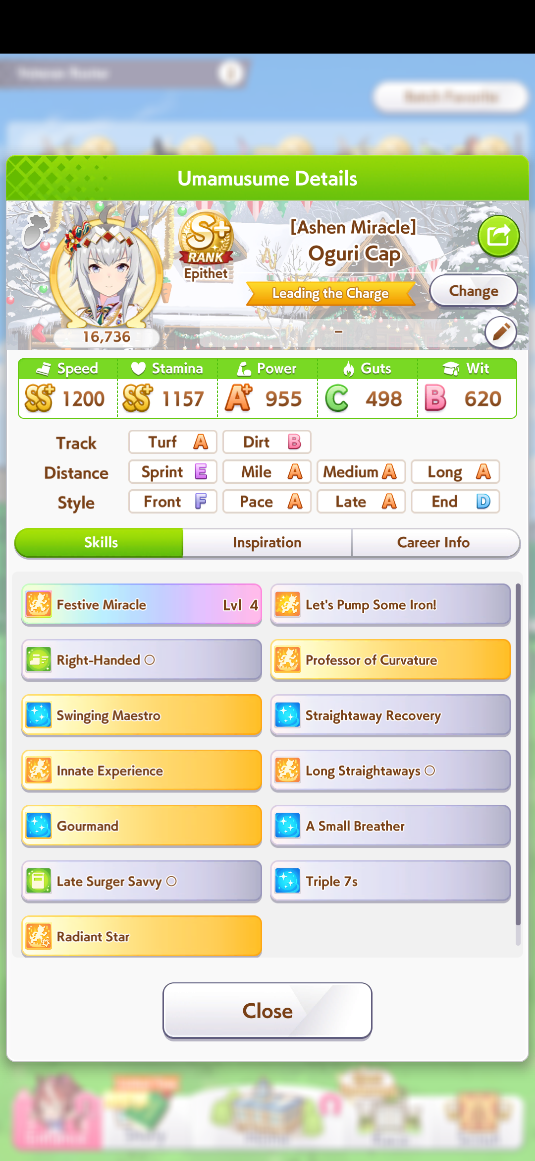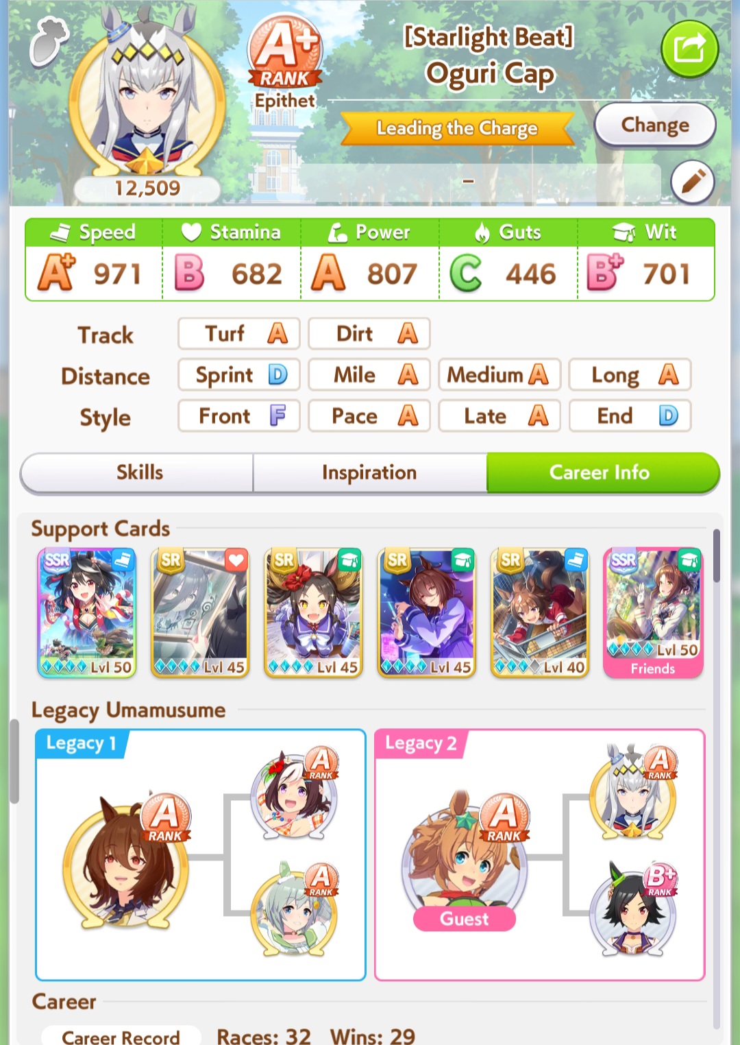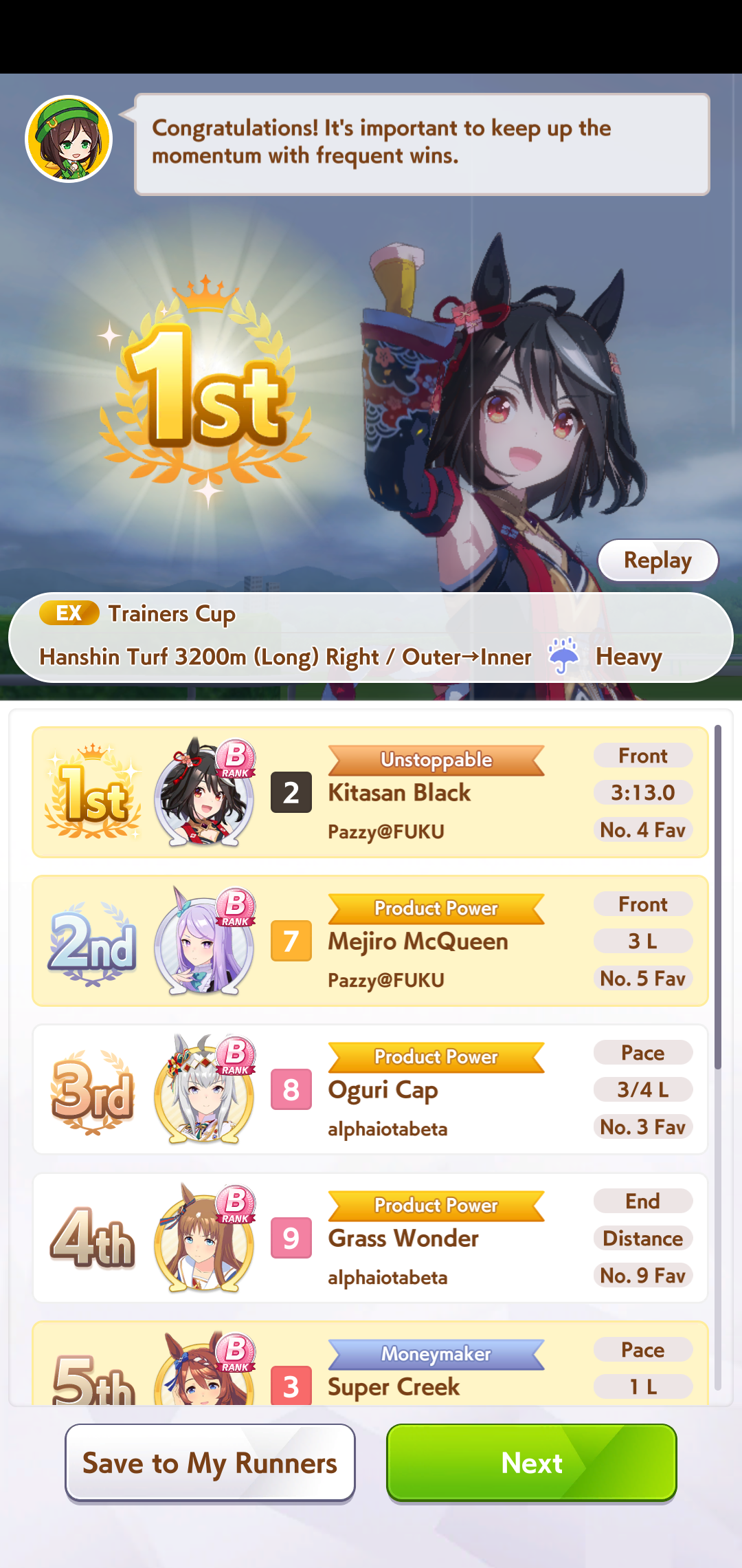 >>562372534Good choice, I will too be pulling on Nishino and Tachyon banners, since I'm a pace chaser main, I already have Taiki but having both is like having Ryan+Dober for late surgers>I do enjoy parent grinding So do I, I enjoy this game in general a lot>Blaze BrianShe was very strong when released but not anymore with the power creeped Umas, but she is still viable and a strong oshi choice, with the right knowledge and inherited uniques she will win games>>562372593You can skip Nishino and just borrow her, I agreeBut having the possibility to customize your own legacy has so much value to me, I use borrows to get insane rolled Umas and I pair them with my good average onesDoing this you can even get 3 inherited uniques or 4 depending on your luckIt's comfy