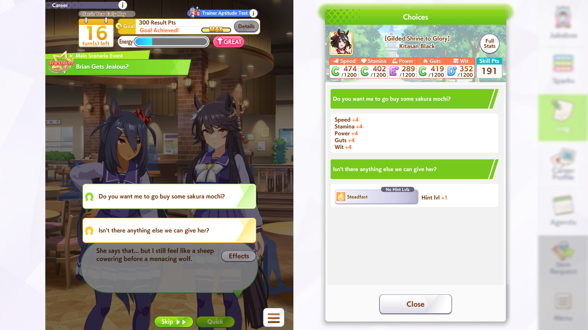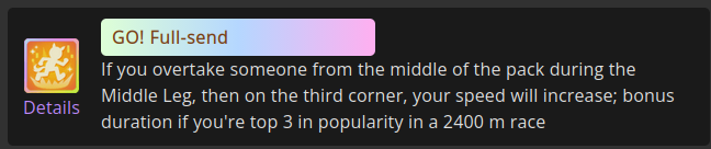 >>562374071In the future it will be way easier to get aptitude for sprint thanks to pink golds, but it is still way more work than just using a sprinter, so it's fine to give her a break from racing. I still bring Topro to sprints alongside two actual sprinters, so our team doesn't get rolled, but she has won some sprint races herself