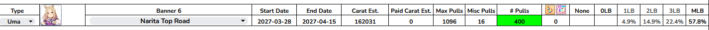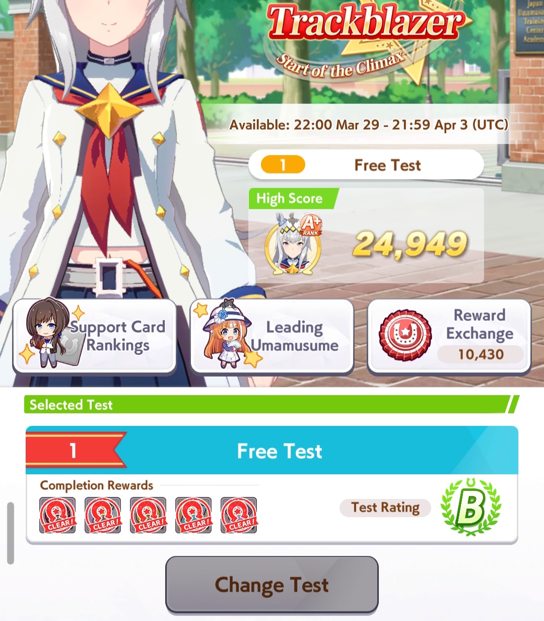 Previous: >>562361138>Global Game NewsLink your account to Cygames iDCurrent Scenario: Make A New Track aka "Trackblazer"Current Rate Up Trainee: Mejiro Bright (3*)Current Rate Up Support Cards: SSR Marvelous Sunday (Guts), SR Curren Chan (Speed)Current CM: Pisces Cup - Hanshin Turf 3200m>Schedule03/02 - 04/14 - Halved TP Cost & 2x Career Mode Rewards04/05 - Ballroom Seiun Sky (3*), Ballroom Fuji Kiseki (3*), Symboli Rudolf (SSR), Sirius Symboli (SSR)04/05 - Ligne Droite Story Event04/12 - Nishino Flower (3*), Daiwa Scarlet (SSR), Sweepy (SR)04/20 - Yaeno Muteki (3*), Ines Fujin (SSR), Twin Turbo (SSR)04/20 - Aries Cup - Medium/Right/Spring/Firm/200004/26 - Golshi Week Celebration04/26 - Cheerleader Nice Nature (3*), Cheerleader King Halo (3*), Bamboo Memory (SSR), Seeking the Pearl (SSR)04/26 - Tracen Cheer Squad Story Event04/30 - Ines Fujin (3*), MR. C.B. (SSR), Tokai Teio (SR)https://pages.snep.pw/uma/anni-skill-changes>JP Game NewsCurrent Rate Up: Sakura Bakushin O (3* alt), North Flight (3* alt), SSR Daring Tact, SSR Daring HeartNew Scenario "Beyond Dreams" releasedTimeline: https://uma.moe/timelineCygames Webstore: https://webstore.cygames.com/en/umamusume_en>Thread Clubshttps://rentry.co/umaglobalclublistYou must be E3 (20k points) to join a circle. Apply with /uma/ or /vg/ in your profile or post ID in the thread.>All Guides & Resourceshttps://rentry.org/uma26Game databasehttps://gametora.com/umamusume (Click the gear to switch between JP / global server info)A basic guide for newfagshttps://rentry.org/umaglobalFind networks if your region is blocked from the game or clienthttps://www.umavpn.topSeiyuu & Concertshttps://rentry.org/umstUmamusume Birthday Calendarhttps://ウマ娘.攻略.tools/events/birthdayUma Texthttps://umareader.idsmile.xyzCustom Stickershttps://schizo.farm/resources/stickersBlessed Good Friday