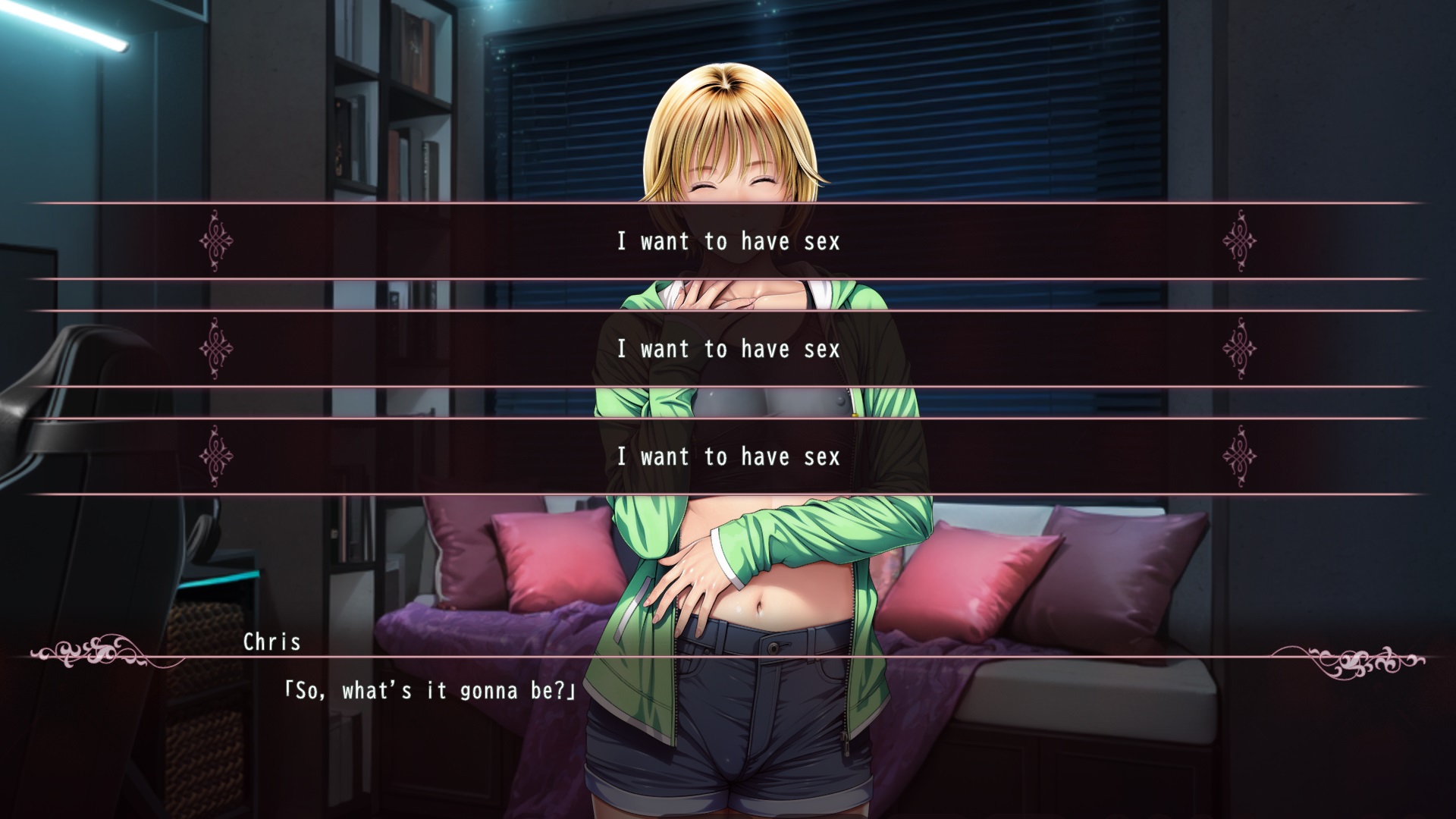 >>562413817Is that the girl with the STD devil contract?Play VNs with pink heroines.