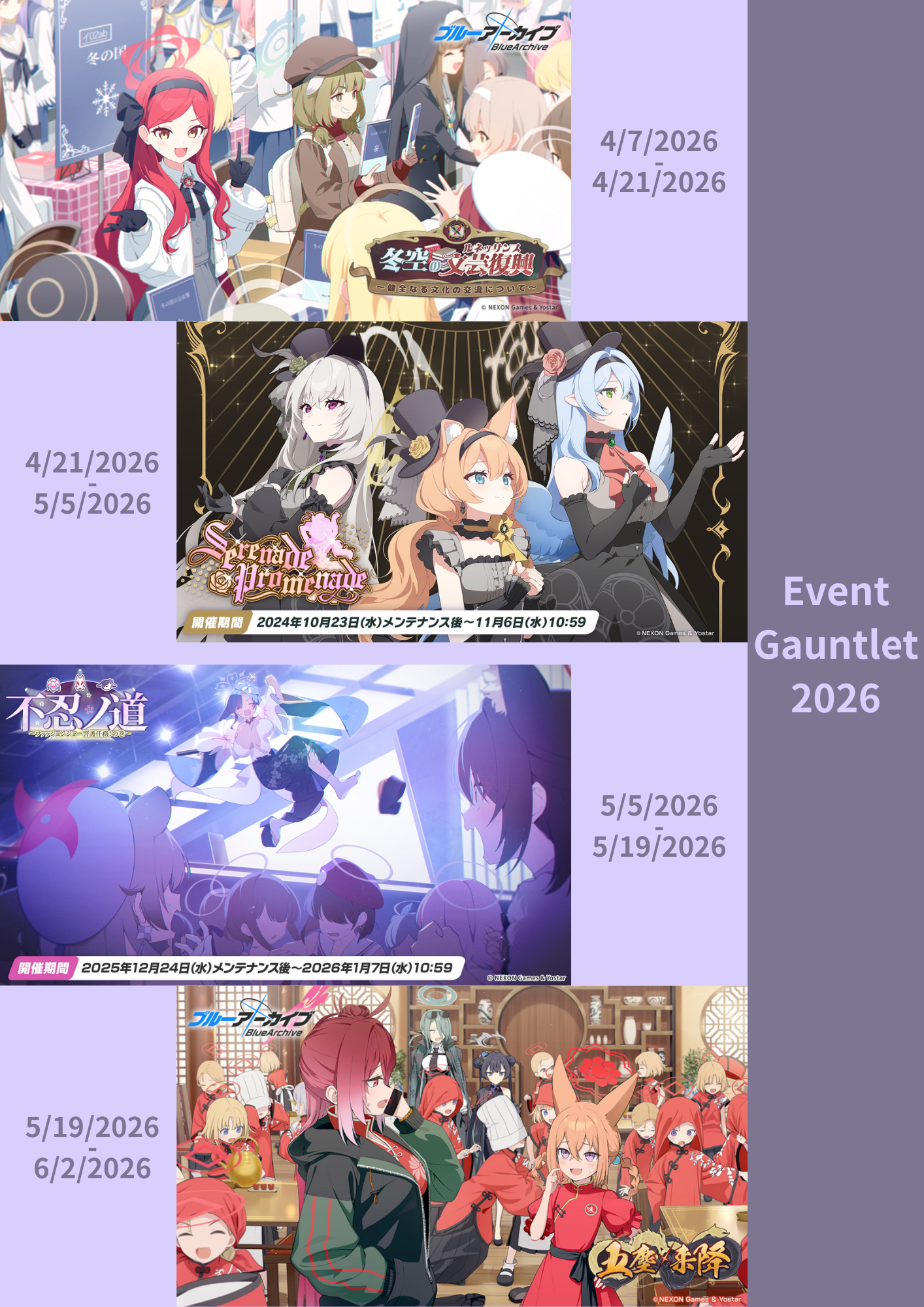 Previous Thread: >>562399013>Guides, Resources and useful links:https://rentry.org/bagguides>/bag/Circles/Clubs/Friends:https://rentry.org/holdingthebag>4koma, Manga, Side Content, PVs & Shortshttps://rentry.org/bacontent>>(JP) – JST>Banners:>4/1 After Maint – 4/15 10:59Akane (School)Seia (Limited)Asuna (School – Limited)Karin (School – Welfare)Toki (Bunny)>News:Patch notes: https://bluearchive.jp/news/newsJump/645>Events:Code: BOX - The Shadow Approaching Millennium – 4/1 After Maint – 4/15 10:59Balancing Schale's Books with the General Student Council – 4/15 11:00 – 4/21 10:59>Content:Joint Firing Drill (Breakthrough) – 4/1 After Maint – 4/8 3:59Grand Assault: Perorodzilla (Field – Torment w/Heavy & Special Armor) – 4/8 11:00 – 4/15 3:59Limit Break Assault: Tiphareth (Indoor – w/Elastic Armor) – 3/19 11:00 – 4/21 3:592x Lesson/Scrimmage – 4/1 4:00 – 4/8 3:592x Hard – 4/8/ 4:00 – 4/15 3:592x Commissions/Bounty – 4/15 4:00 – 4/21 3:59>>(GLOBAL) – UTC>Banners:>3/31 2:00 – 4/7 1:59SubaruUi (Swimsuit – Limited)Hinata (Swimsuit – Limited)ReisaMine>News:Patch notes: https://forum.nexon.com/bluearchive-en/board_view?thread=3403455>Events:My Office: https://bluearchive.nexon.com/user/myoffice>Content:Grand Assault: Hieronymus (Urban – Torment w/Special & Light Armor) – 3/31 2:00 – 4/6 18:59Limit Break Assault: Tiphareth (Indoor – w/Elastic Armor) – 3/11 2:00 – 4/6 18:592x Normal – 3/30 19:00 – 4/3 18:592x Hard – 4/3 19:00 – 4/6 18:592x Bounty – 4/6 19:00 – 4/13 18:592x Account EXP – 4/10 19:00 – 4/12 18:592x Normal/Hard – 4/13 19:00 – 4/20 18:592x Account EXP – 4/17 19:00 – 4/19 18:592x Lesson/Scrimmage – 4/20 19:00 – 4/27 18:592x Bounty – 4/27 19:00 – 5/4 18:59