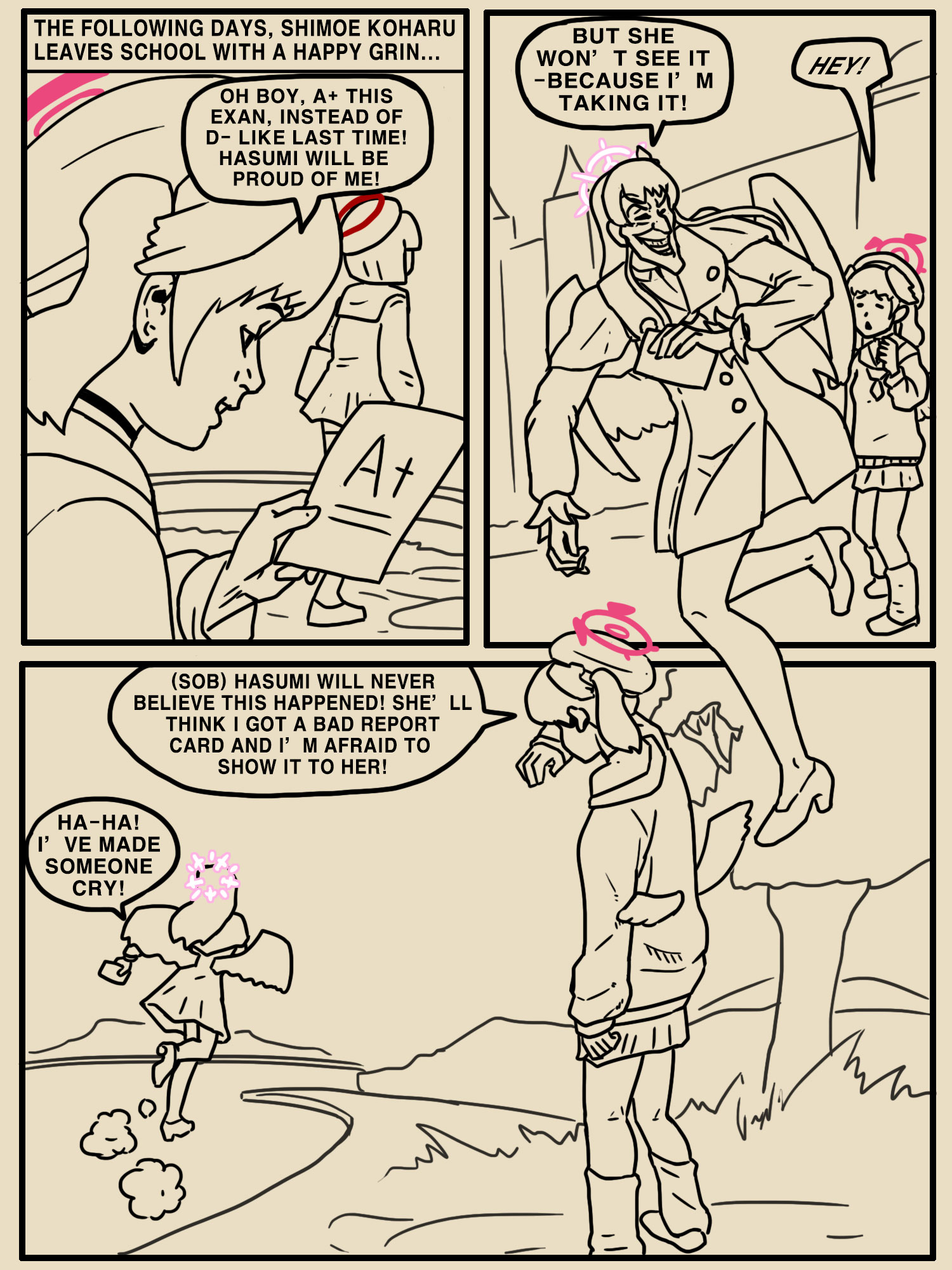 Man in Kivotos goes to doctor. Says he's depressed. Says life seems harsh and cruel. Says he feels all alone in a threatening world where what lies ahead is vague and uncertain. Doctor says, 'Treatment is simple. Sensei of Schale is in the Sanctum Tower and he gives good dick. Go and see him. That should pick you up.' Man bursts into tears. Says, 'But doctor...'