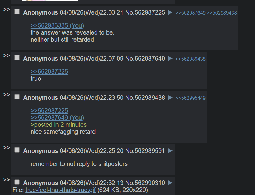 >>562998584Don't worry guys. I think you're BOTH faggots.