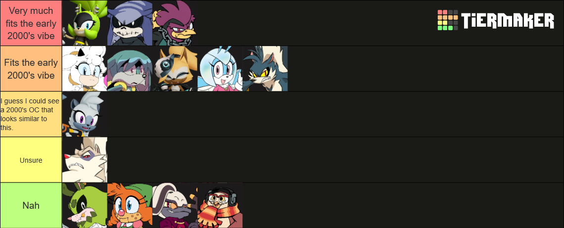 >>562448235Its the>The pants>the the spiked rings on the glove>the colors >hair style (both up and down)>the piercings>the personality>the backstorySurge represents that early 2000's era of the sonic fandom completely perfectly. Which makes sense since her creators are 2000's era sonic fandom members. Kit fits too, so does Lanolin, and Whisper, and Jewel, and I think Tangle to a degree. Tangle is a bit of mixed bag her design feels more modern than 2000's vibe to me. But I could see some girl anime obsessed fan in the early 2000's designing Jewel, and some edgy kid from the 2000's designing Whisper.