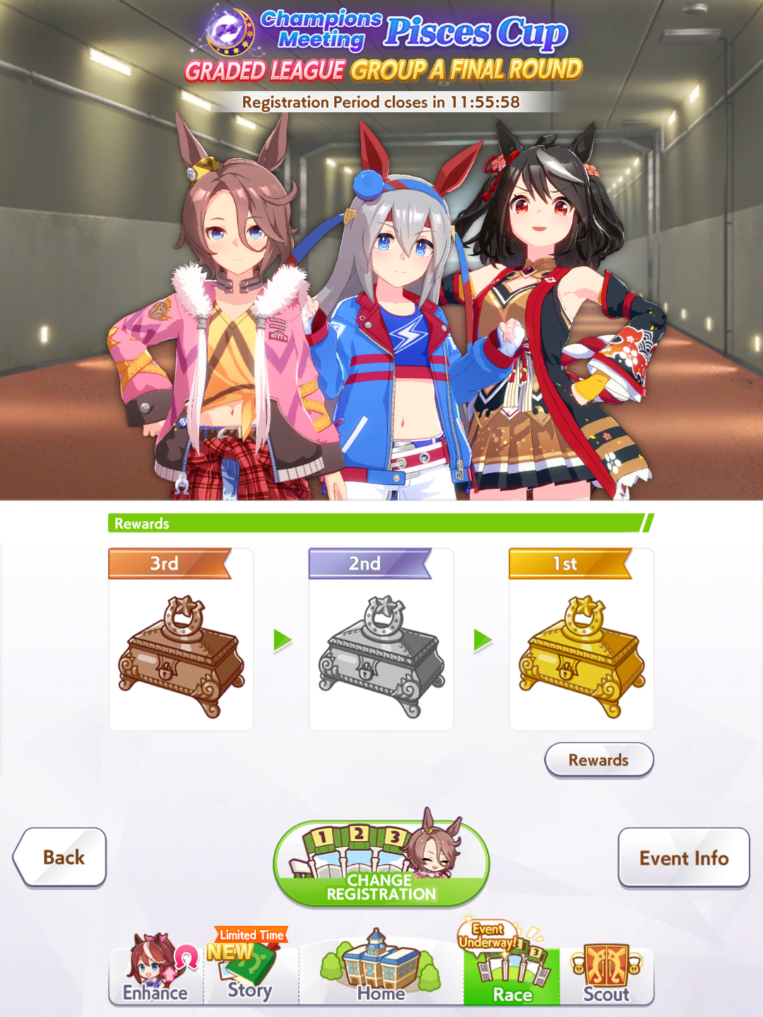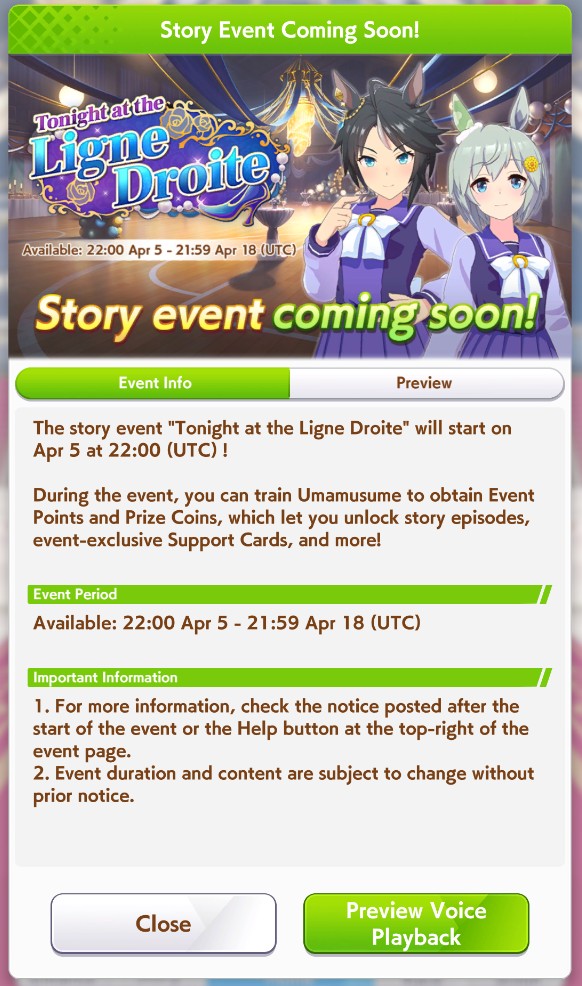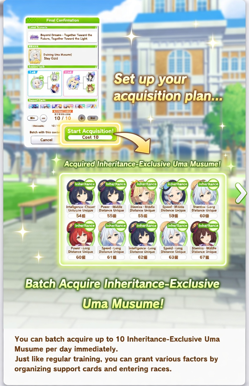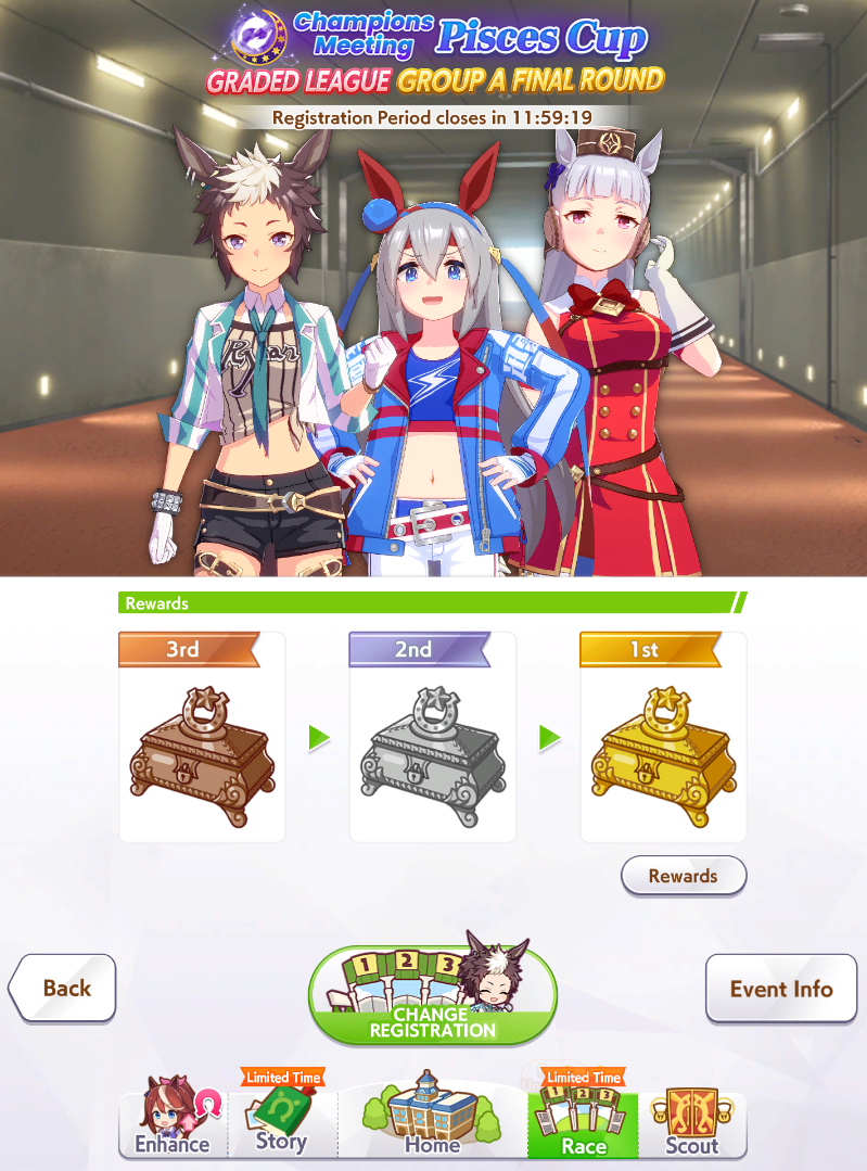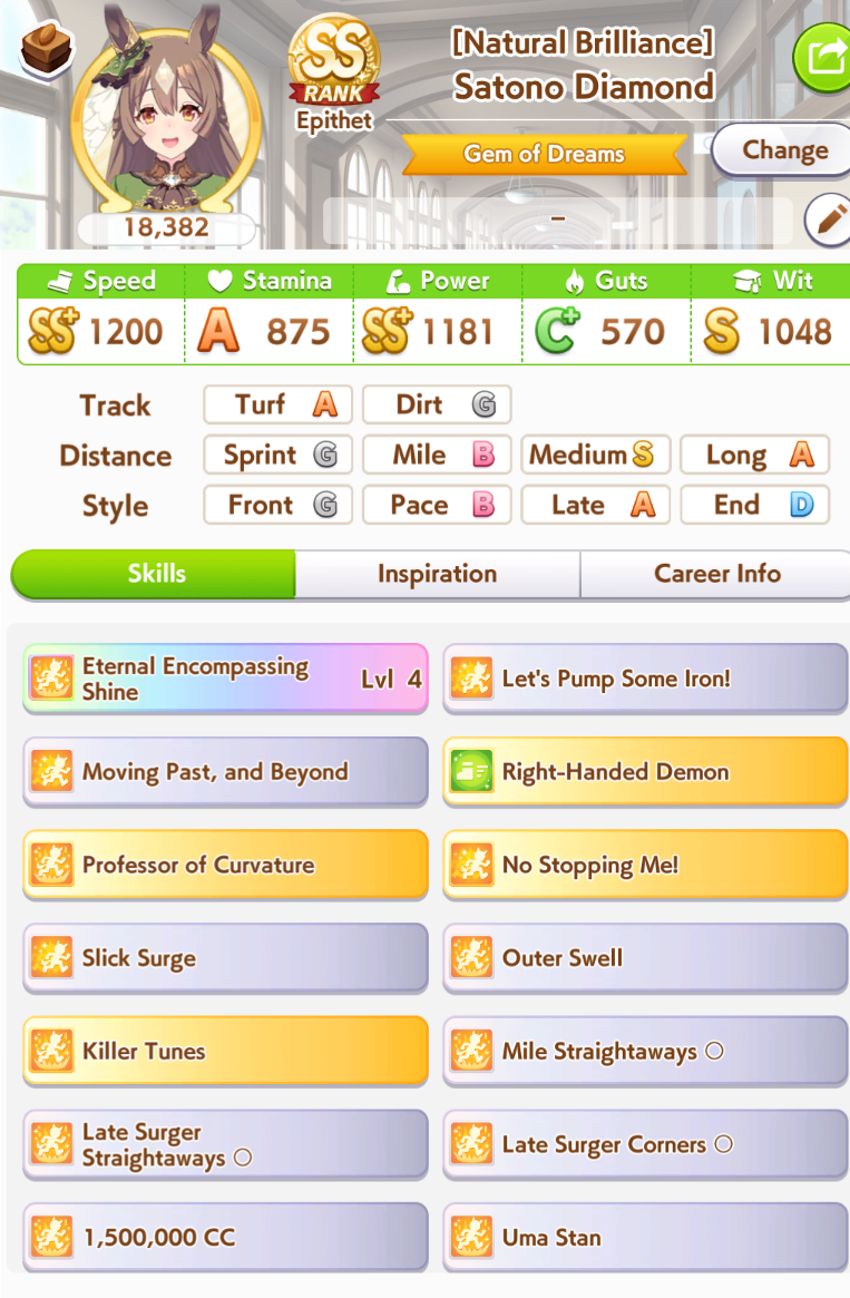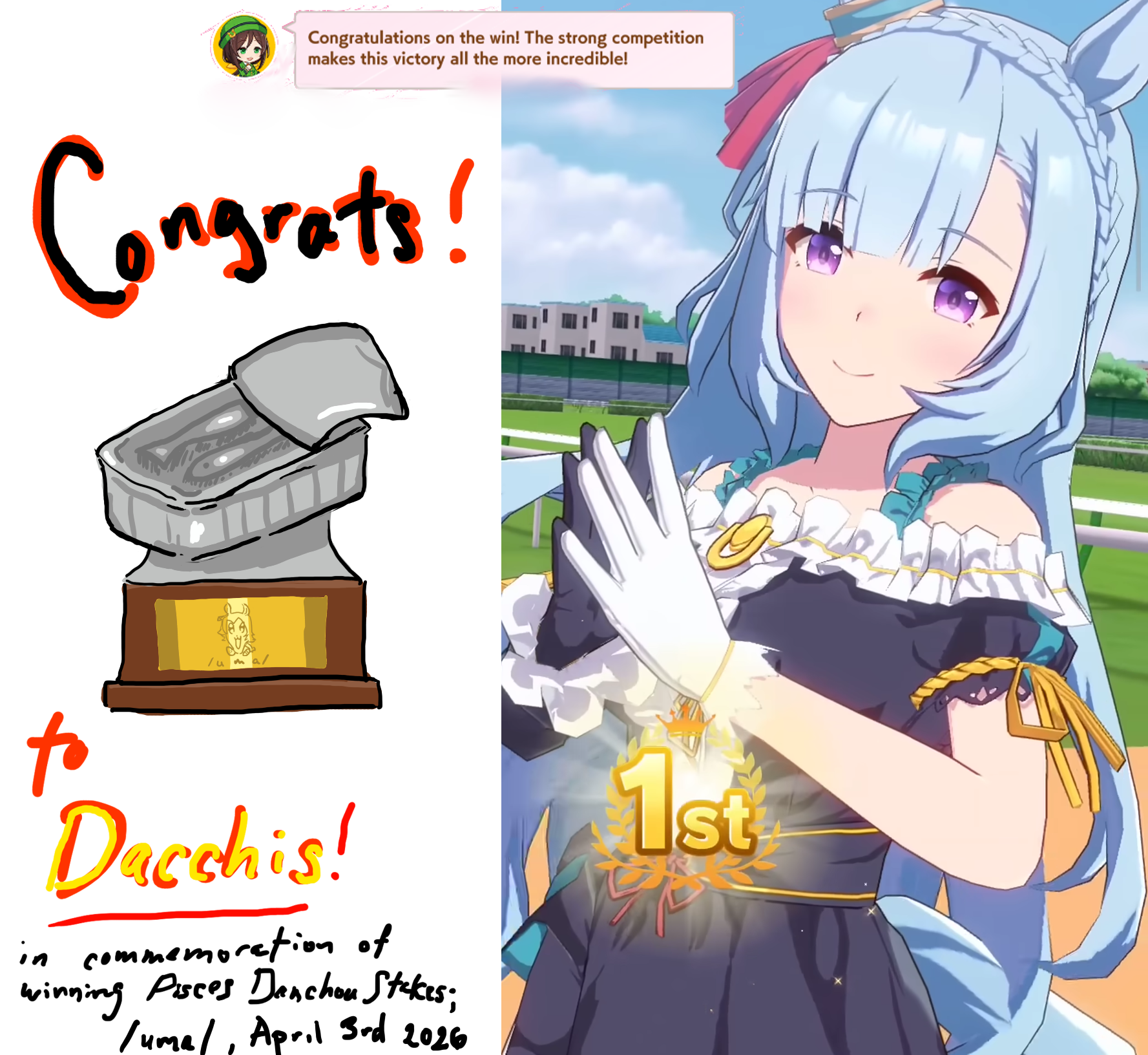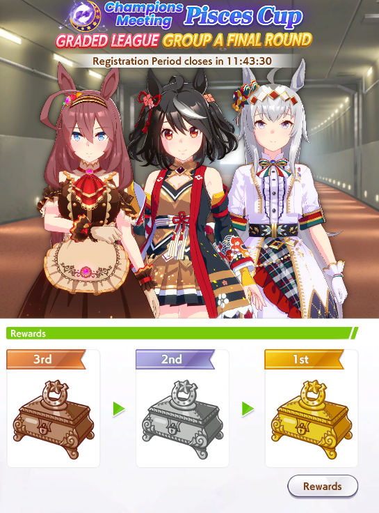 Previous: >>562432680>Global Game NewsLink your account to Cygames iDCurrent Scenario: Make A New Track aka "Trackblazer"Current Rate Up Trainee: Mejiro Bright (3*)Current Rate Up Support Cards: SSR Marvelous Sunday (Guts), SR Curren Chan (Speed)Current CM: Pisces Cup - Hanshin Turf 3200m>Schedule03/02 - 04/14 - Halved TP Cost & 2x Career Mode Rewards04/05 - Ballroom Seiun Sky (3*), Ballroom Fuji Kiseki (3*), Symboli Rudolf (SSR), Sirius Symboli (SSR)04/05 - Ligne Droite Story Event04/12 - Nishino Flower (3*), Daiwa Scarlet (SSR), Sweepy (SR)04/20 - Yaeno Muteki (3*), Ines Fujin (SSR), Twin Turbo (SSR)04/20 - Aries Cup - Medium/Right/Spring/Firm/200004/26 - Golshi Week Celebration04/26 - Cheerleader Nice Nature (3*), Cheerleader King Halo (3*), Bamboo Memory (SSR), Seeking the Pearl (SSR)04/26 - Tracen Cheer Squad Story Event04/30 - Ines Fujin (3*), MR. C.B. (SSR), Tokai Teio (SR)https://pages.snep.pw/uma/anni-skill-changes>JP Game NewsCurrent Rate Up: Sakura Bakushin O (3* alt), North Flight (3* alt), SSR Daring Tact, SSR Daring HeartNew Scenario "Beyond Dreams" releasedTimeline: https://uma.moe/timelineCygames Webstore: https://webstore.cygames.com/en/umamusume_en>Thread Clubshttps://rentry.co/umaglobalclublistYou must be E3 (20k points) to join a circle. Apply with /uma/ or /vg/ in your profile or post ID in the thread.>All Guides & Resourceshttps://rentry.org/uma26Game databasehttps://gametora.com/umamusume (Click the gear to switch between JP / global server info)A basic guide for newfagshttps://rentry.org/umaglobalFind networks if your region is blocked from the game or clienthttps://www.umavpn.topSeiyuu & Concertshttps://rentry.org/umstUmamusume Birthday Calendarhttps://ウマ娘.攻略.tools/events/birthdayUma Texthttps://umareader.idsmile.xyzCustom Stickershttps://schizo.farm/resources/stickers