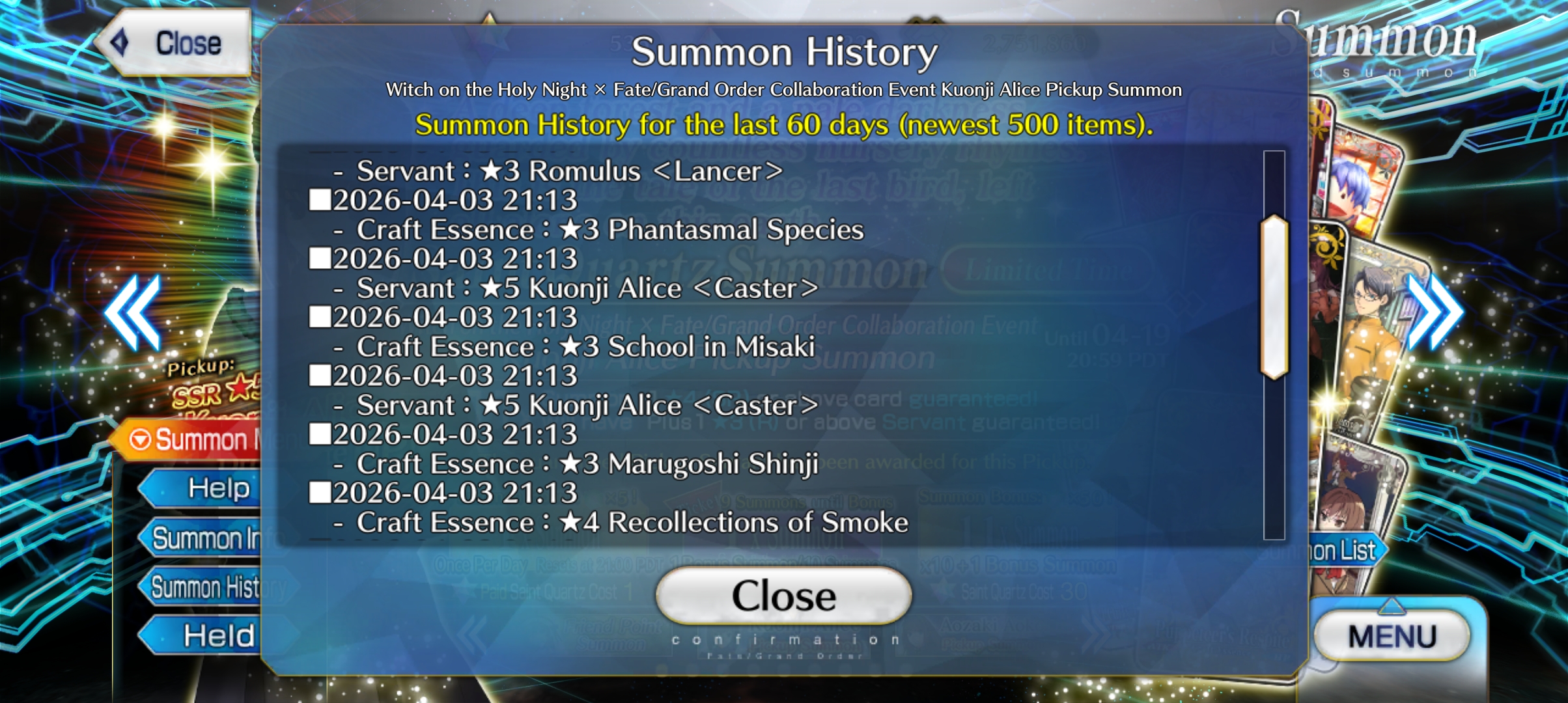 Previous: >>562367876> [Event] Witch on the Holy Night × Fate/Grand Order Collaboration Event "After Witch on the Holy Night/Murder at the Kumano Hot Springs - The Robin Saw It! Magicians Only Live Twice"https://webview.fate-go.us/2026/0324_witch_night/2026-03-30 01:00 - 04-19 20:59 PDT>[Summon] Witch on the Holy Night Collaboration Event Aozaki Aoko Pickup Summonhttps://webview.fate-go.us/2026/0329_witch_night_pu1/2026-03-30 01:00 - 04-19 20:59 PDT>[Teaser] Witch on the Holy Night Collaboration Event Kuonji Alice Pickup Summonhttps://webview.fate-go.us/2026/0329_witch_night_alice_pu/2026-04-03 21:00 - 04-19 20:59 PDT>[Quest] "Olga Marie Quest_2" Appears on the Bleached Earth!https://webview.fate-go.us/iframe/2026/0323_olgamally_quest_2/2026-03-22 21:00 PDT>[Campaign] Ordeal Call New Duties Unlocked: Part 6https://webview.fate-go.us/iframe/2026/0319_ordeal_call_cp6/2026-03-22 21:00 - 04-05 20:59 PDT>[Campaign] Pilgrimage Festival: Part 8https://webview.fate-go.us/iframe/2026/0319_pilgrimage_fes_8/2026-03-22 21:00 - 04-05 20:59 PDT>[News]https://webview.fate-go.us/>[Servant Info]Servant Material Lookup: https://fgosim.github.io/Material/Servant Planner: https://github.com/chaldea-center/chaldeaCoin Calculator: https://fgo-servant-coins.glitch.me/index.htmlRank Up + Interlude Timeline: https://kazemai.github.io/fgo-vz/relate_quest.htmlRate Up Tracker: https://tohnocoding.github.io/fgobanners/>[Mats/Summoning Info]Rateups in FGO JP: https://files.catbox.moe/lf1qmz.pngQuartz for next Summer: https://docs.google.com/spreadsheets/d/1iRH60QpLNvHy9MMDKLJGNSg4s7FsDfdXtJtOUVDj5po/edit?gid=162156045#gid=162156045FGO Event Compendium: https://docs.google.com/spreadsheets/d/1qvxLU407QwiFaCvItqR16SqqAVlLD5u5nBzY_bCFYvs/edit#gid=2111060397Drop Rates: https://docs.google.com/spreadsheets/d/1_SlTjrVRTgHgfS7sRqx4CeJMqlz687HdSlYqiW-JvQAFGO Raw Database: https://apps.atlasacademy.io/>[FAQ]https://rentry.org/alter-faq