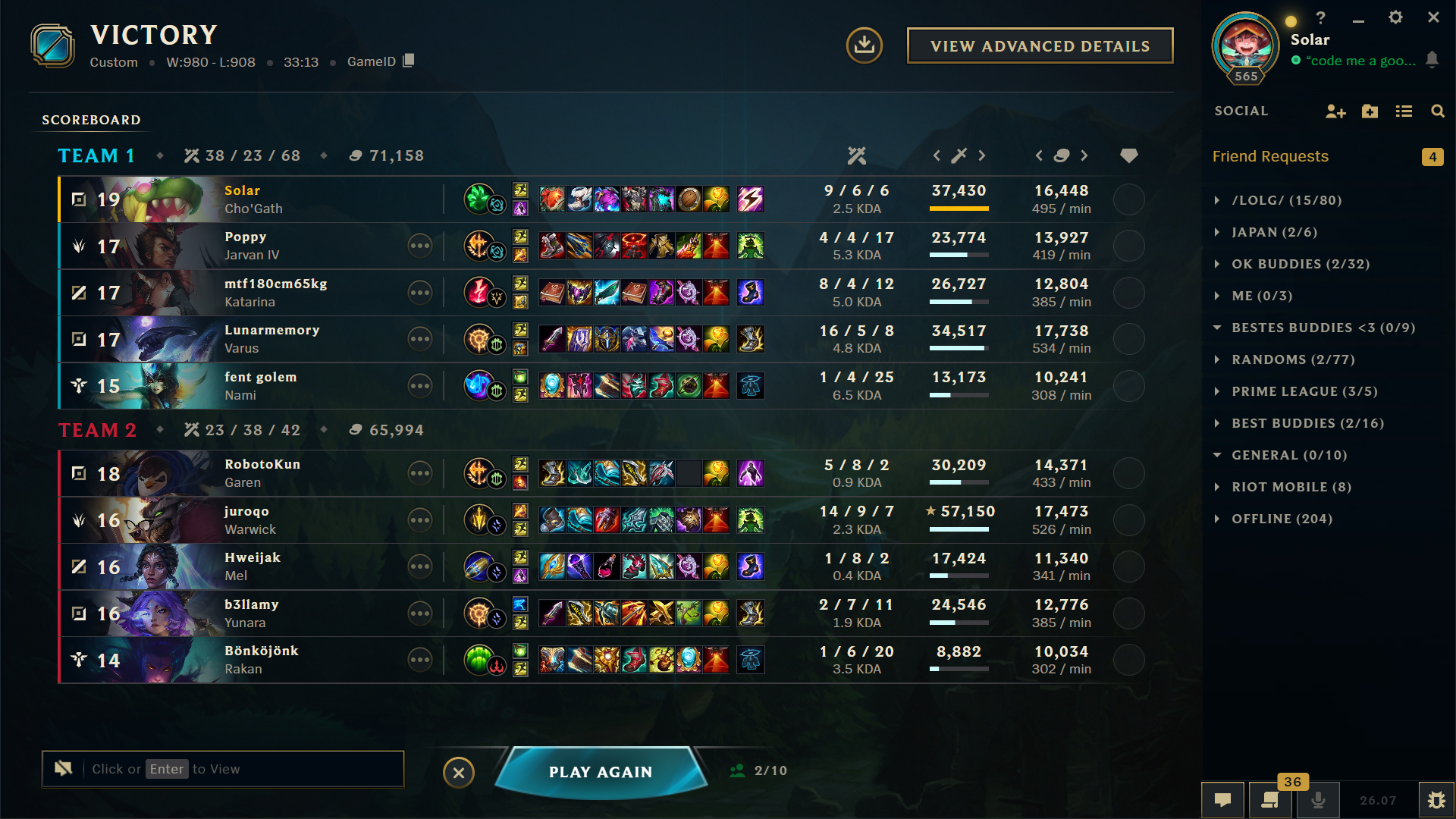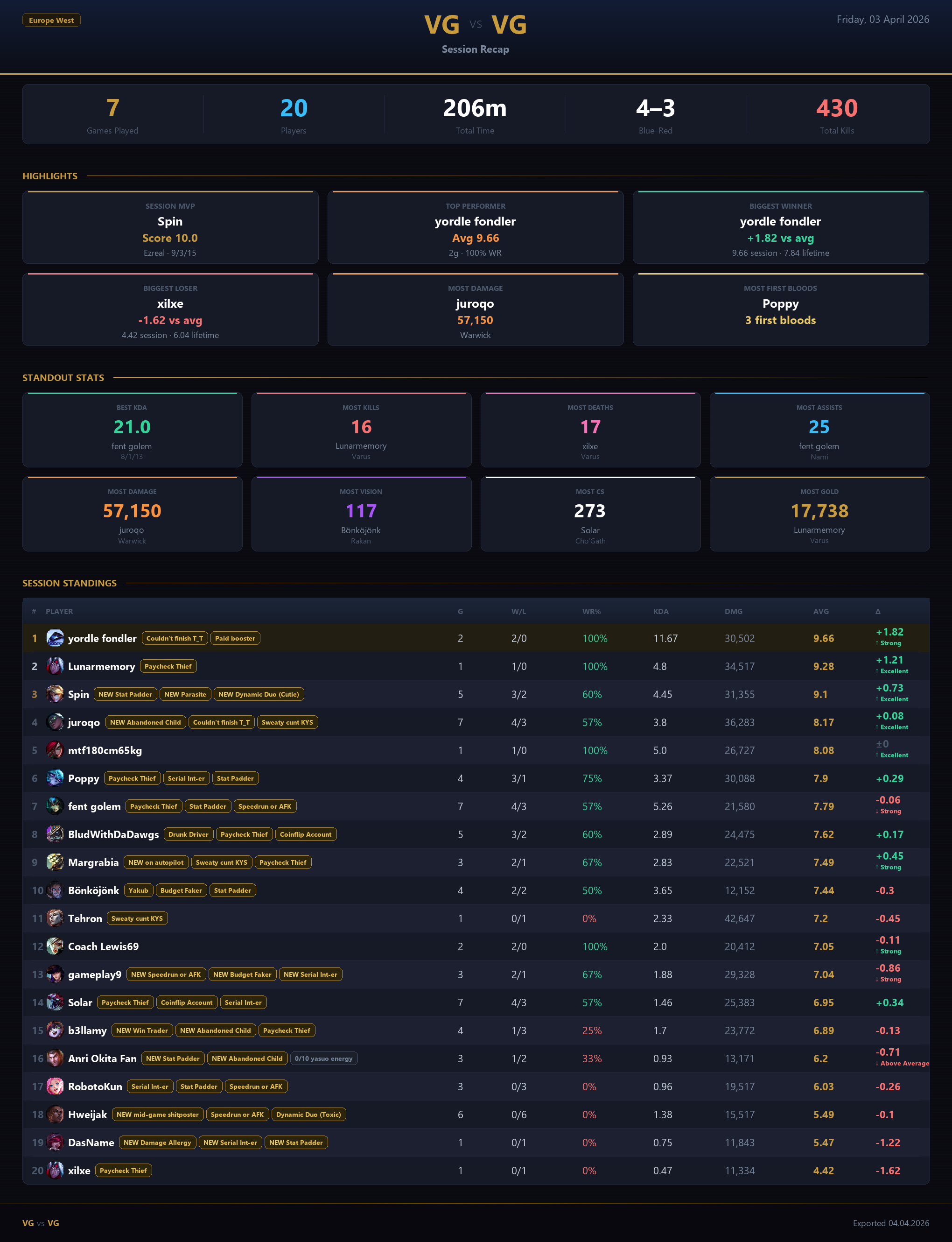 EUWVGS SESSION RECAP - 03.04.2026today was a really good day!!!!!! I had to do some vibe balancing when it didnt look correct but overall the balancing looked really good (the one game I let other people tell me how to balance was the one unbalanced game)sorry for being so late with the recap too, I had some problems with the script im using to import the games into my system where it wouldn't properly click on the 7th game, but thats fixed now.Well cya guys tomorrow!remember: the hate fuels me, so keep giving me your best shots.