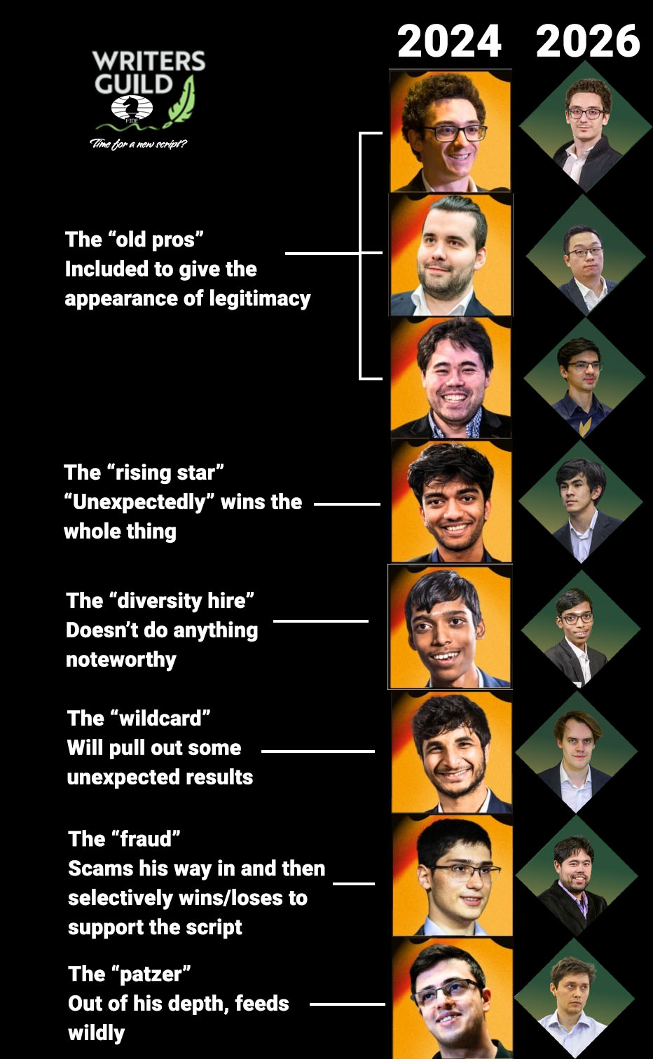 Ding>B Tier Super GM gets hot at the right time>Sneaks into the WCC because Magnus dropped out>Wins the WCCGukesh>B Tier Super GM gets hot at the right time>Wins the Candidates>Wins the WCCSindarov>B Tier Super GM gets hot at the right time>Wins the CandidatesIs this going to be the new pattern?