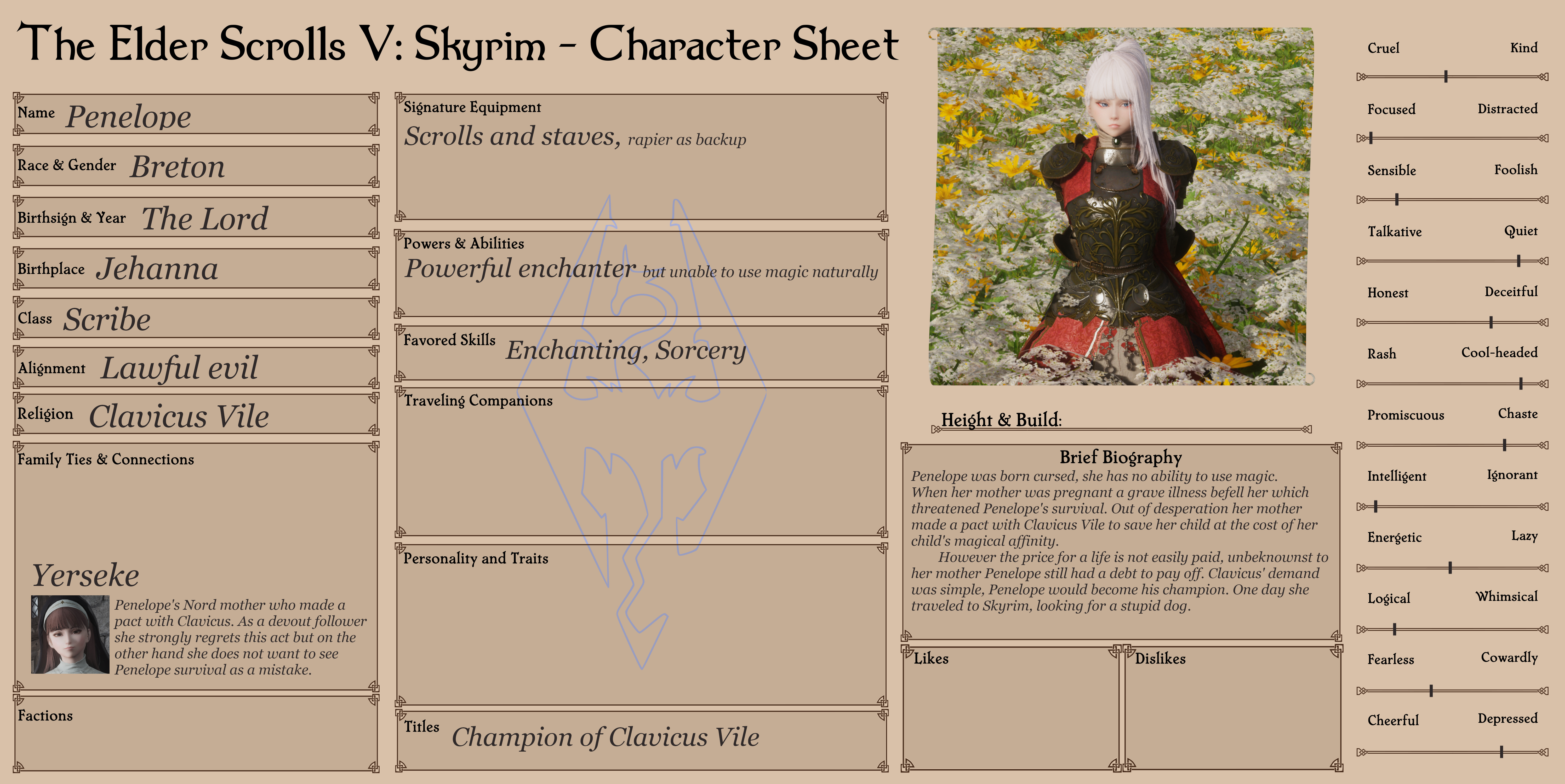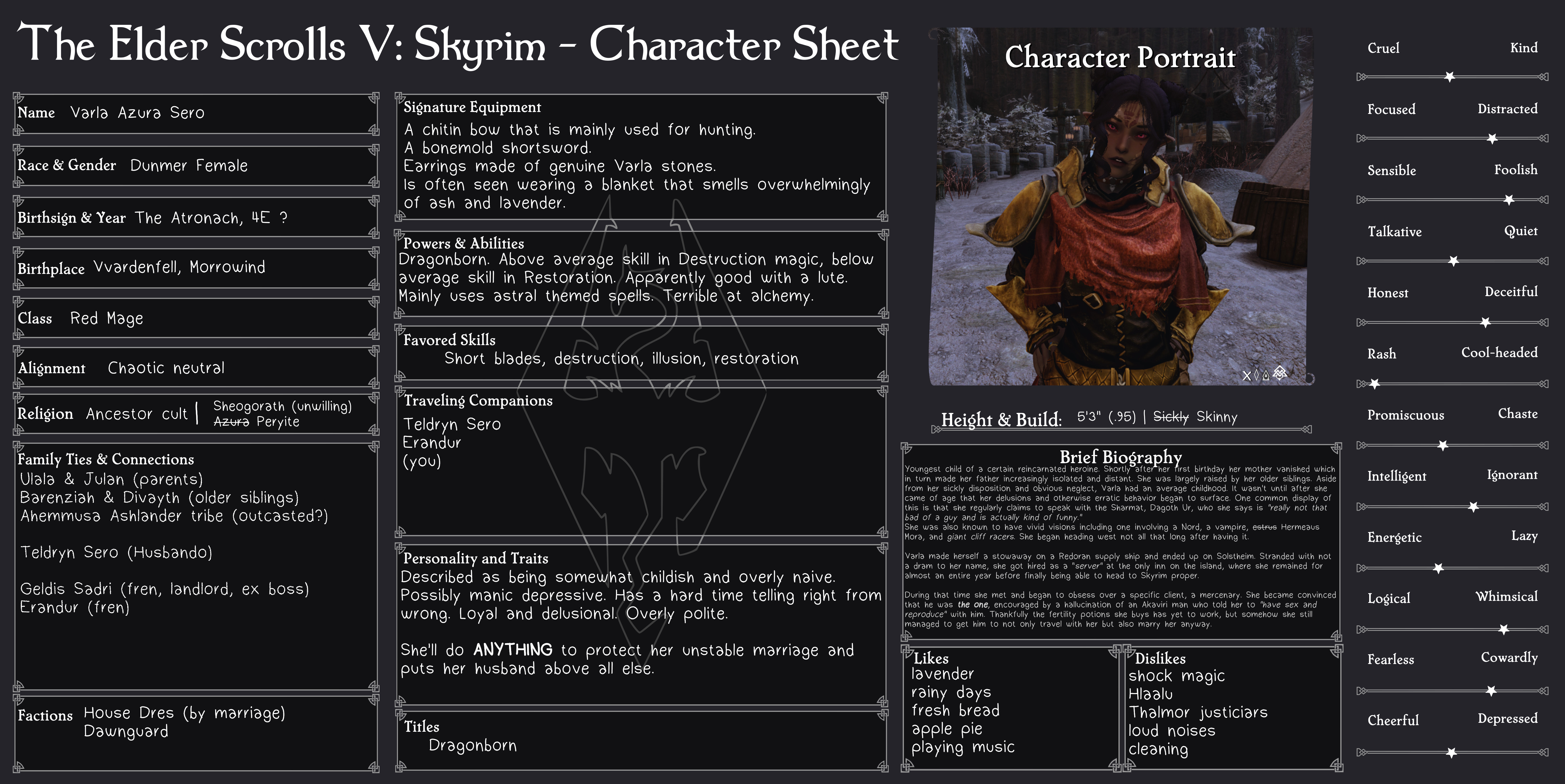 >>562574694Her appearance is also a little more serious, was the first thing I noticed. Maybe I'll do it on another character and she will have gotten more serious over various adventures.If that were the case it would be funny to have a follower mature over the tortuously long lifespan of modding the game (2 decades), especially because she lived in Hammerfell which would therefore have been an easy locale to repurpose towardsmakes me wonder if any other characters would improve/degrade over a span like that