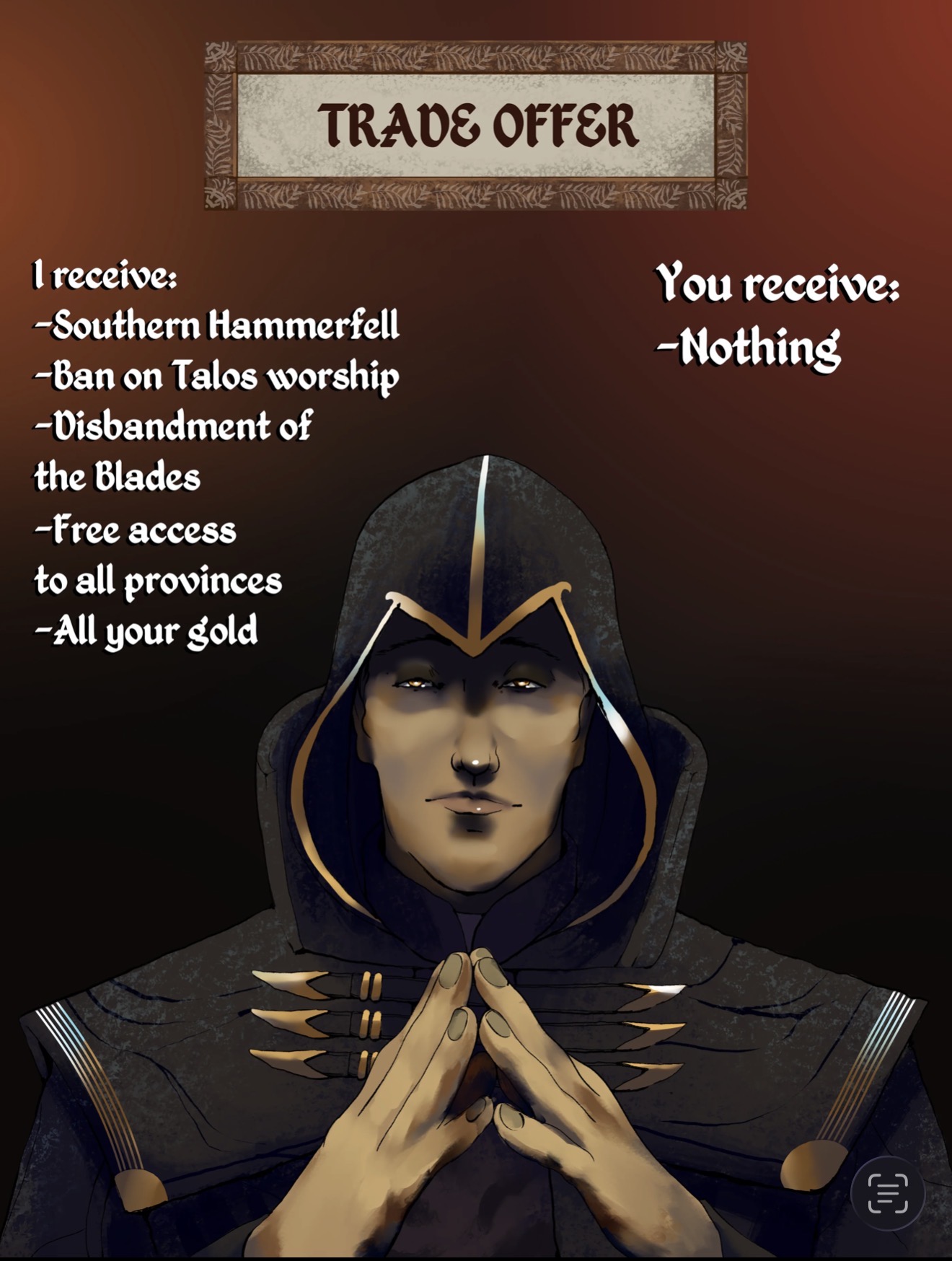 This latest economic scarcity regarding nightshade got me to thinking. That’s a high-priority ingredient when it comes to making Skooma, and I have to be more proactive stockpiling that shit. That’s on me. So I thought I’d approach Nazeem and ask if he wanted to turn his farm over to growing nightshade full-time. I even made him a good offer, but all he did was laugh at me because I had to buy fucking food. Anyway, I still like the idea. So go around and ask these farmers if someone is willing to become our primary nightshade producer. And by “someone” I mean the first farm you come to. If they want to be a fuckball about it just smoke two or three until they see things our way, and it’s a fine day with you around.