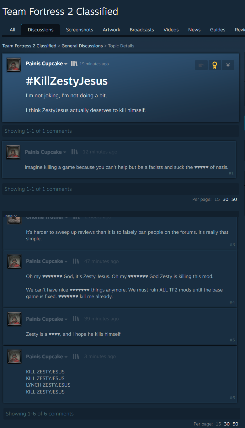 >>562751330Zesty just scratched the surface. There's more lore to be found.> my being usurped from the team by danielmm8888 in 2015> the danielmm8888/pelpix incident in 2016> the various falling-apart's of the team that led to the creation of tf2 vintage, open fortress and team deathmatch classic> the complete dead silence for a few years before 2.0 came out in 2020> the current team somewhat recently hiring a self-confessed pedophile, which led to that info being outed, and the pedophile (along with a guy named Agent Agrimmar) being removed from the tf2c team. it wasn't stated why Agrimmar was removed but my guess is he was also a pedophileI'd help Zesty and provide him with everything I know given my creating tf2c in the first place, but he called me a schizo after I donated to him on one of his streams, so he can go fuck himself with a barbed iron rod.