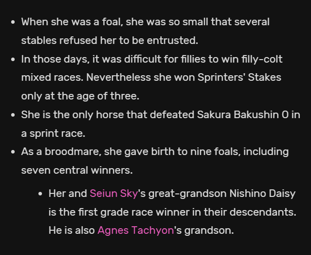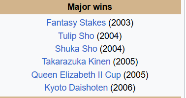 >>562507262Pretty good horse, she won the QEC, one part of the tiara and the takarakuza kinen, the horse just was stubborn as fuck sometimes, remember just 1 G1 is already a huge accomplishment